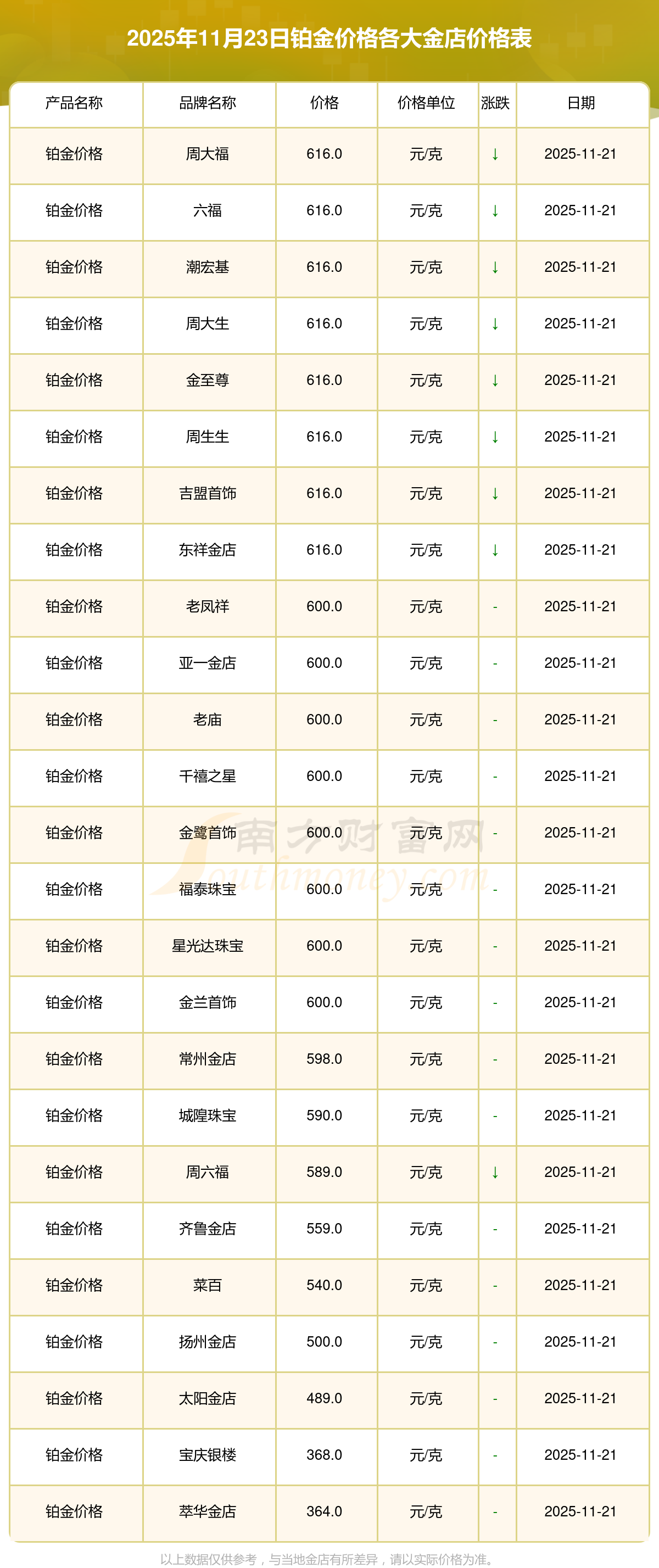 今天是2025年11月23日,周大福、周大福、周大福、周大福、周大福、周大福、周大福、老鳳祥、老鳳祥、老鳳祥、周六福等各大金店品牌鉑金價(jià)格最新價(jià)格如下:周大福1305.0元/克、周大福616.0元/克、周大福1305.0元/克、周大福45110.0、周大福17570.0、周大福40690.0、周大福1143.0元/克、老鳳祥1298.0元/克、老鳳祥600.0元/克、老鳳祥1298.0元/克、周六福1266.0元/克。
