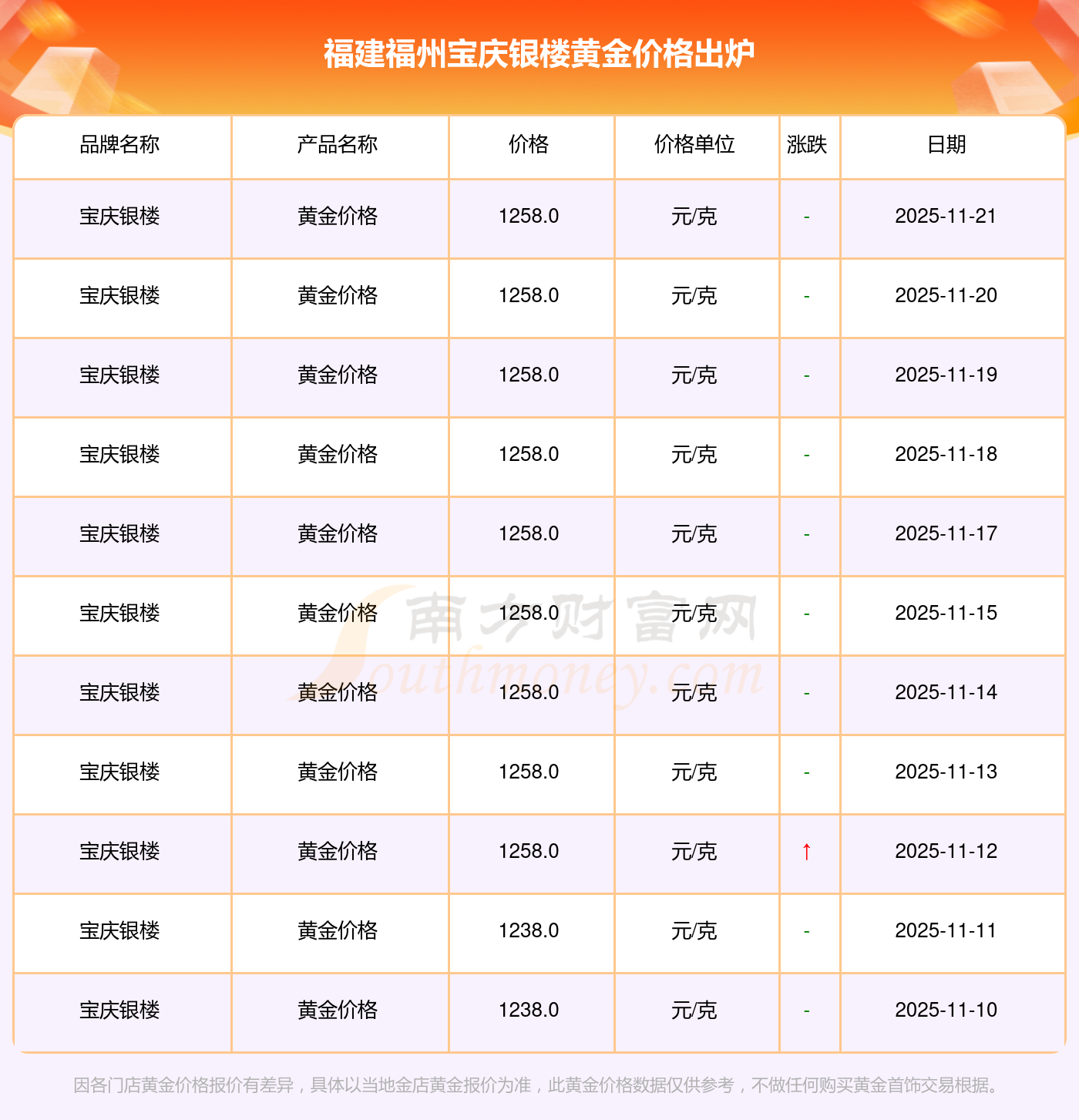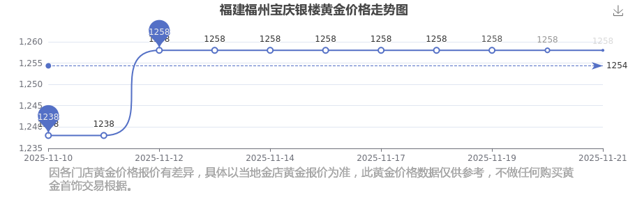 福建福州寶慶銀樓在 2025年11月23日的黃金價(jià)格零售價(jià)格為 1258.0元/克。