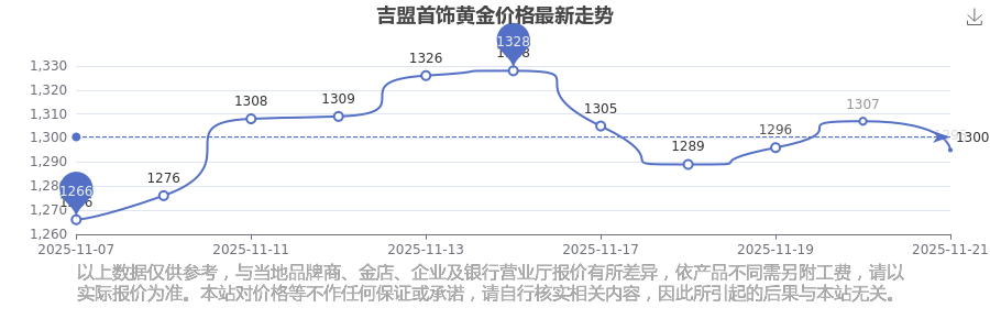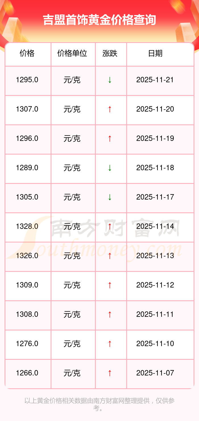 今日(2025年11月23日),吉盟首飾黃金價格最新價格為1295.0元/克。