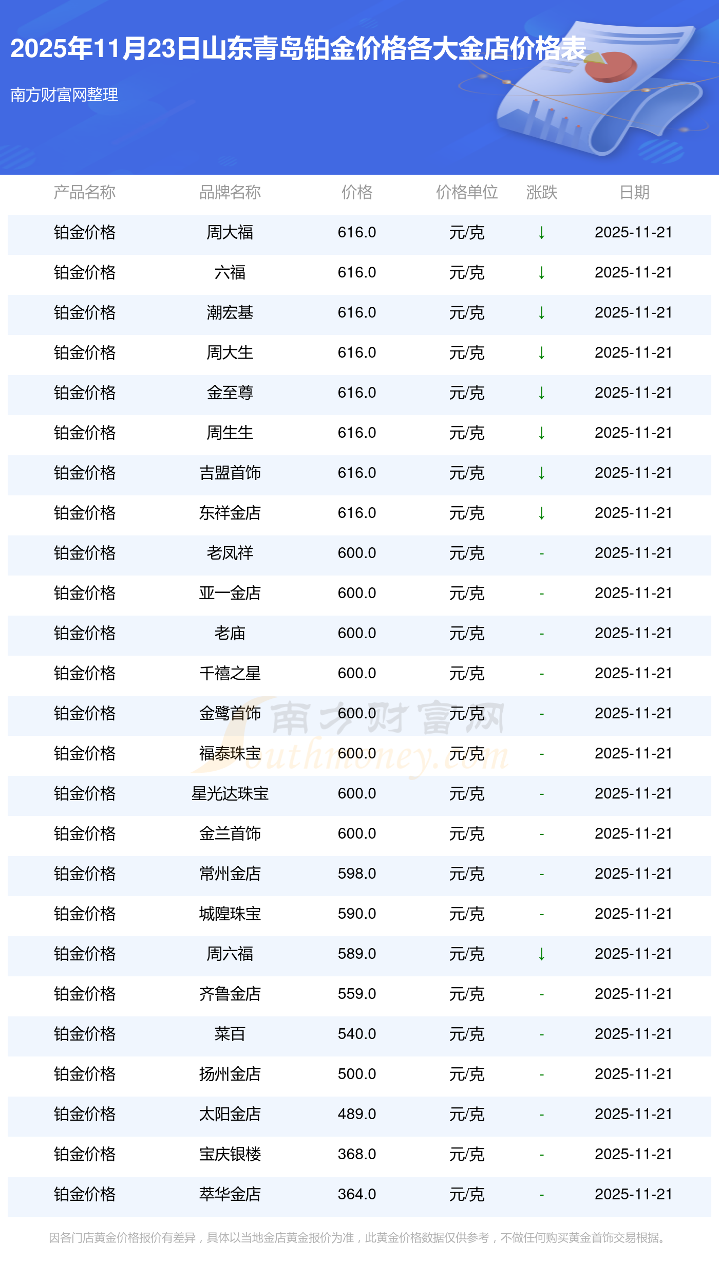 2025年11月23日山東青島各大金店鉑金價格最新價格:周大福1305.0元/克,周大福616.0元/克,周大福1305.0元/克,周大福45110.0,周大福17570.0,周大福40690.0,周大福1143.0元/克,老鳳祥1298.0元/克,老鳳祥600.0元/克,老鳳祥1298.0元/克,周六福1266.0元/克。