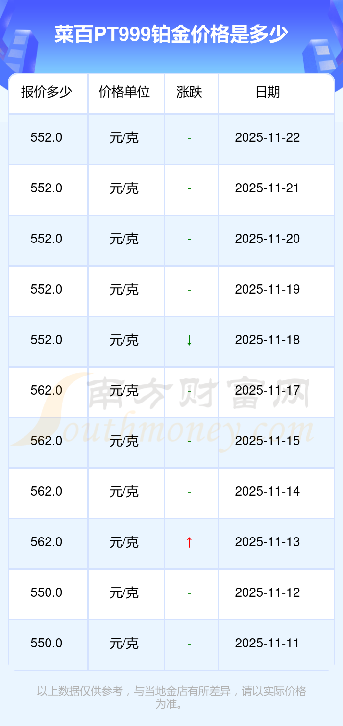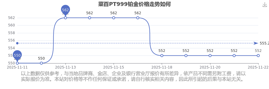 今日(2025年11月24日)菜百PT999鉑金價(jià)格是552.0元/克。