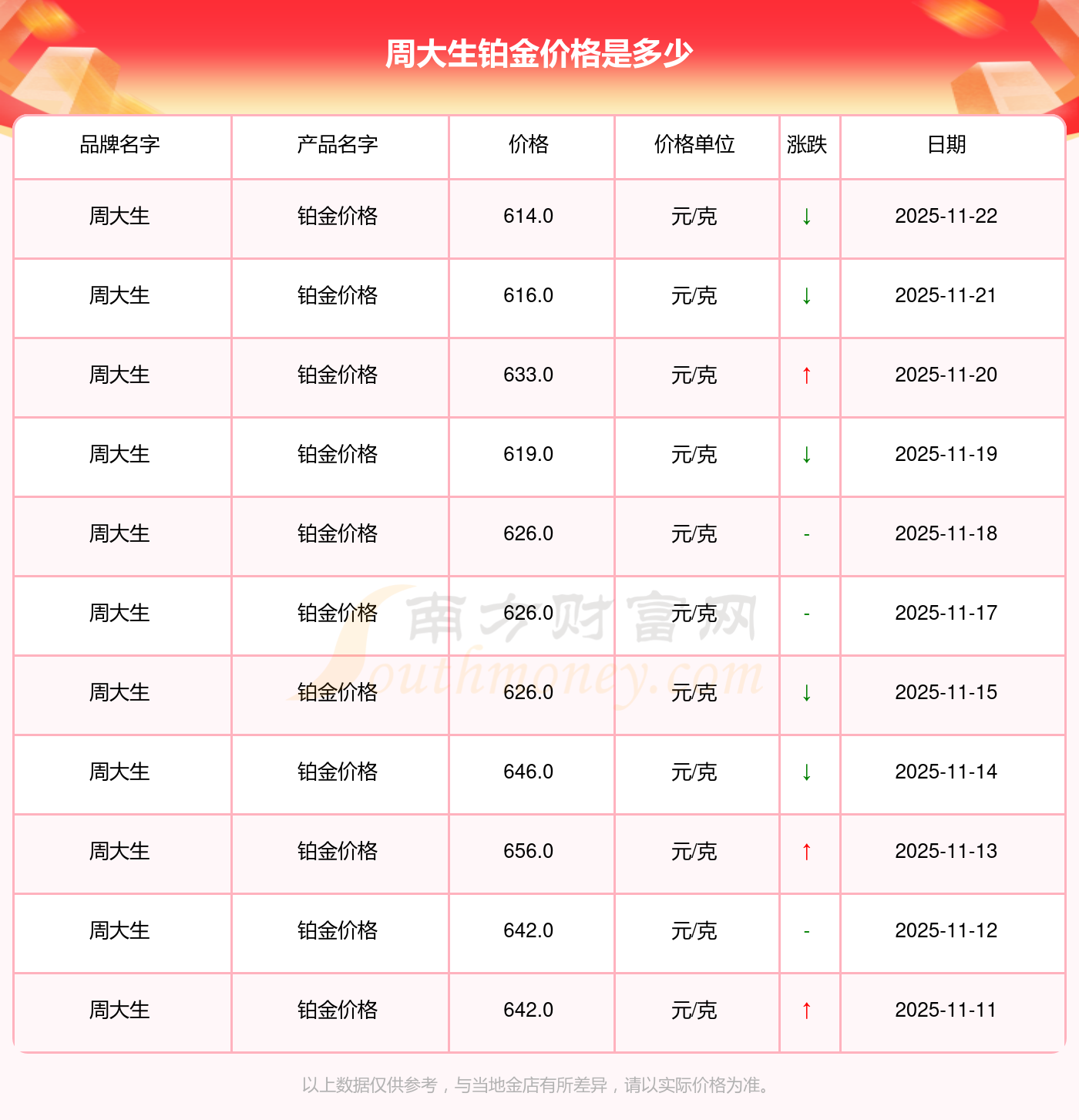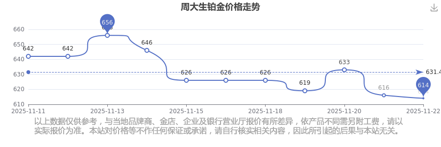 今日周大生鉑金價(jià)格最新價(jià)格為614.0元/克。