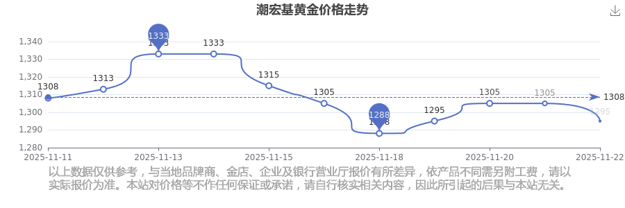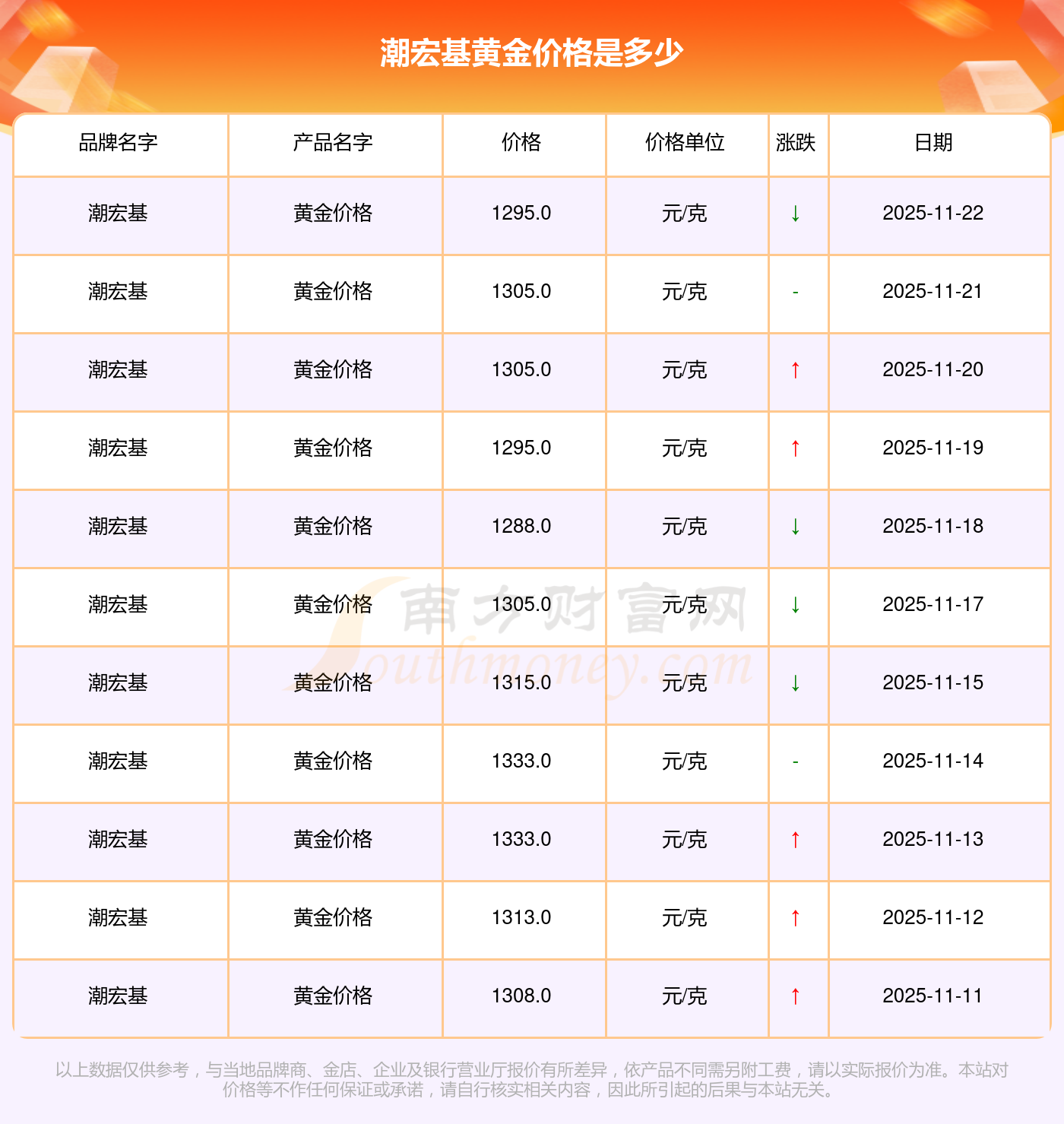 潮宏基今日黃金價(jià)格的最新標(biāo)價(jià)為1295.0元/克。