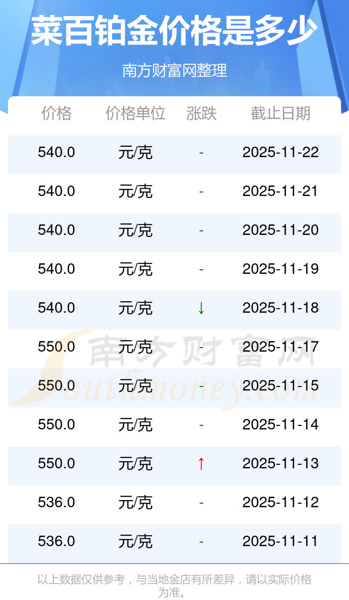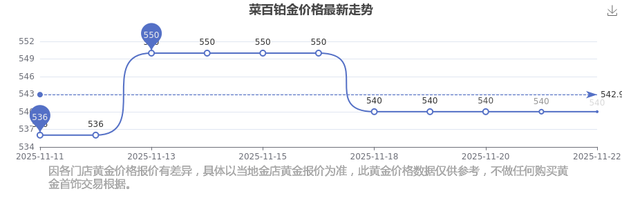 菜百 鉑金價格在今日的最新價格顯示為540.0元/克。