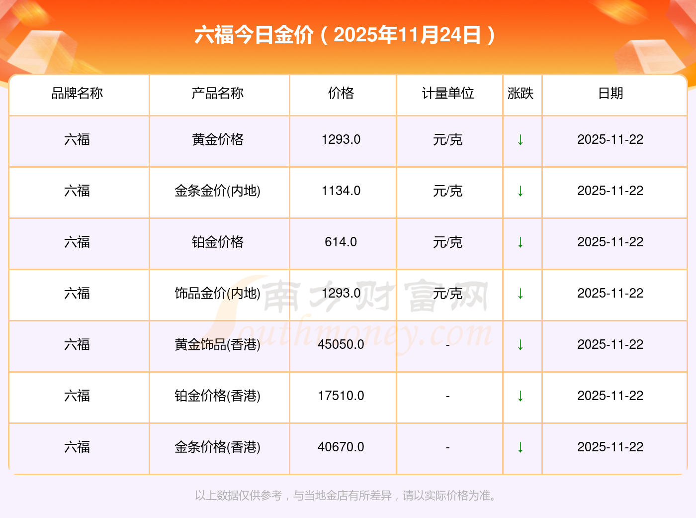 2025年11月24日六福最新價格:黃金價格1295.0元/克,鉑金價格614.0元/克,飾品金價(內地)1295.0元/克,黃金飾品(香港)45100.0,鉑金價格(香港)17510.0,金條價格(香港)40680.0,金條金價(內地)1134.0元/克,黃金價格1305.0元/克,鉑金價格600.0元/克,足金價格1305.0元/克,黃金價格1266.0元/克。