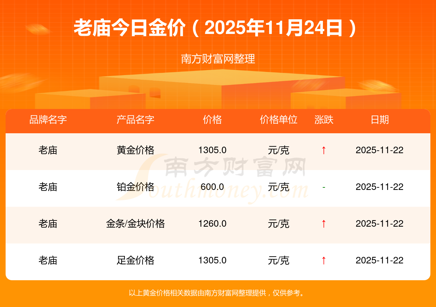 老廟金價今日價格:黃金價格1295.0元/克,鉑金價格614.0元/克,飾品金價(內(nèi)地)1295.0元/克,黃金飾品(香港)45100.0,鉑金價格(香港)17510.0,金條價格(香港)40680.0,金條金價(內(nèi)地)1134.0元/克,黃金價格1305.0元/克,鉑金價格600.0元/克,足金價格1305.0元/克,黃金價格1266.0元/克。