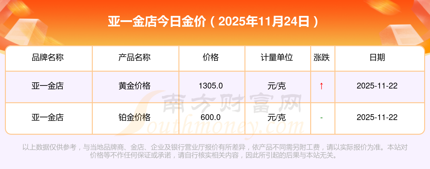 亞一金店今日金價(jià)的具體數(shù)字是怎樣的?數(shù)據(jù)來(lái)了:黃金價(jià)格1295.0元/克,鉑金價(jià)格614.0元/克,飾品金價(jià)(內(nèi)地)1295.0元/克,黃金飾品(香港)45100.0,鉑金價(jià)格(香港)17510.0,金條價(jià)格(香港)40680.0,金條金價(jià)(內(nèi)地)1134.0元/克,黃金價(jià)格1305.0元/克,鉑金價(jià)格600.0元/克,足金價(jià)格1305.0元/克,黃金價(jià)格1266.0元/克。