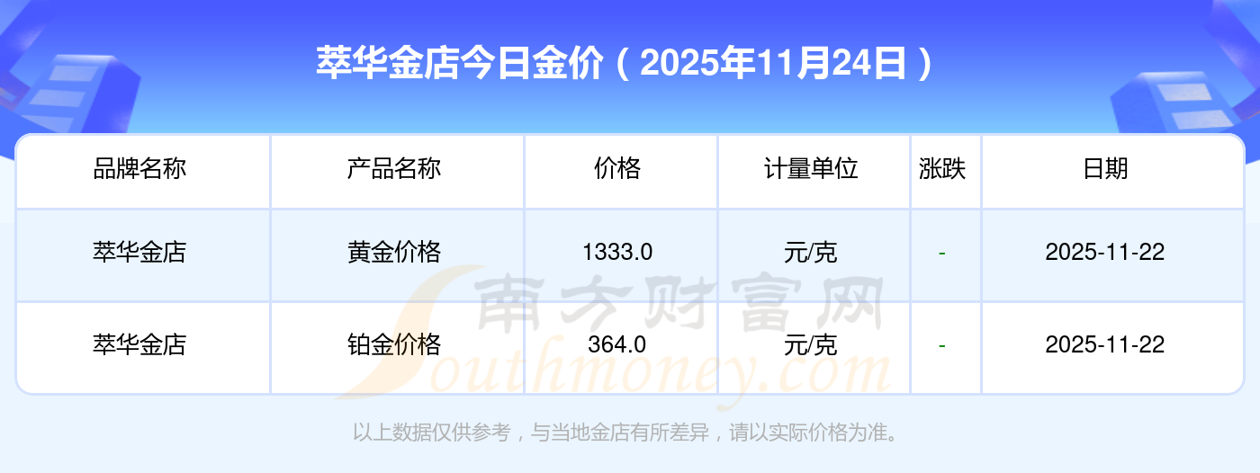 今日黃金價格報價最高的金店是萃華金店,為1333.0元/克,報價最低的金店是寶慶銀樓,為1258.0元/克。今日黃金價格高低差為75元/克。