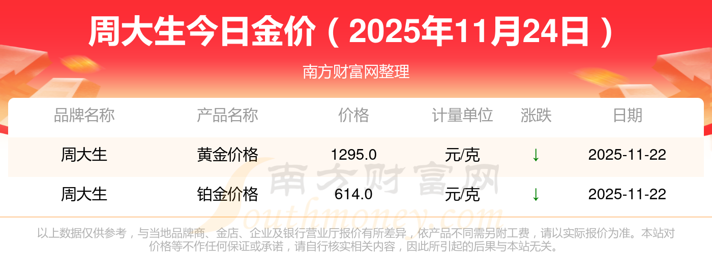2025年11月24日周大生金價查詢:黃金價格1295.0元/克,鉑金價格614.0元/克,飾品金價(內(nèi)地)1295.0元/克,黃金飾品(香港)45100.0,鉑金價格(香港)17510.0,金條價格(香港)40680.0,金條金價(內(nèi)地)1134.0元/克,黃金價格1305.0元/克,鉑金價格600.0元/克,足金價格1305.0元/克,黃金價格1266.0元/克。