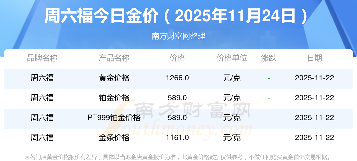 2025年11月24日周六福今日價格:黃金價格1295.0元/克,鉑金價格614.0元/克,飾品金價(內(nèi)地)1295.0元/克,黃金飾品(香港)45100.0,鉑金價格(香港)17510.0,金條價格(香港)40680.0,金條金價(內(nèi)地)1134.0元/克,黃金價格1305.0元/克,鉑金價格600.0元/克,足金價格1305.0元/克,黃金價格1266.0元/克。