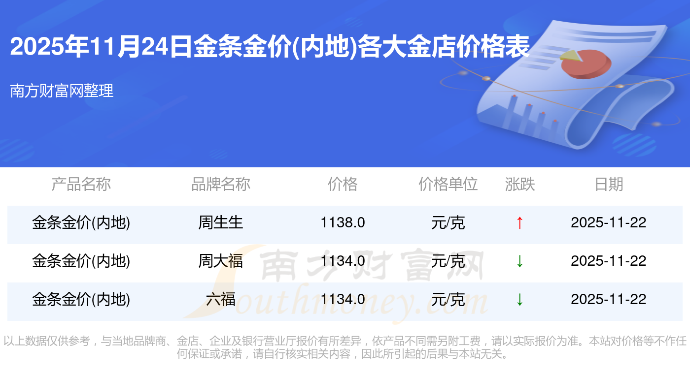 今天是2025年11月24日,周大福、周大福、周大福、周大福、周大福、周大福、周大福、老鳳祥、老鳳祥、老鳳祥、周六福等各大金店品牌金條金價(內(nèi)地)最新價格如下:周大福1295.0元/克、周大福614.0元/克、周大福1295.0元/克、周大福45100.0、周大福17510.0、周大福40680.0、周大福1134.0元/克、老鳳祥1305.0元/克、老鳳祥600.0元/克、老鳳祥1305.0元/克、周六福1266.0元/克。