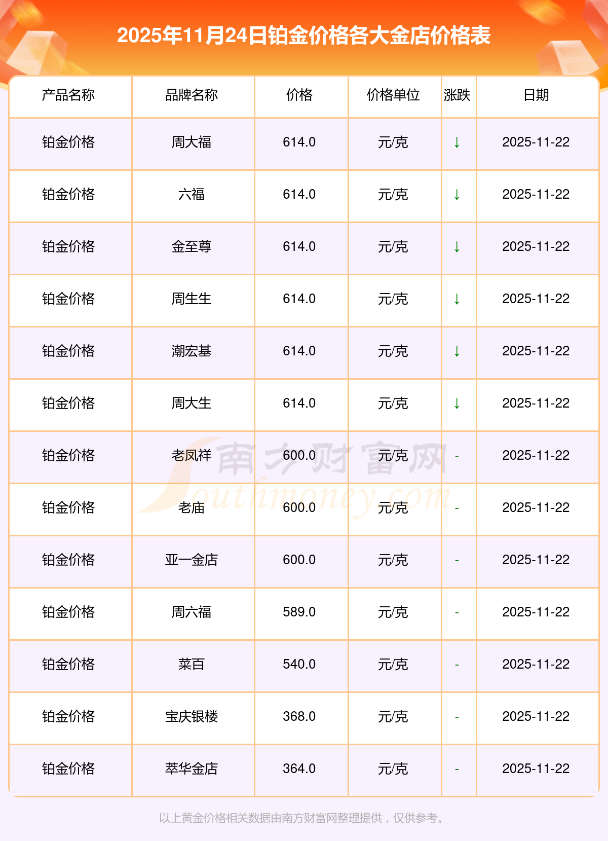 2025年11月24日,周大福、周大福、周大福、周大福、周大福、周大福、周大福、老鳳祥、老鳳祥、老鳳祥、周六福等各大金店品牌鉑金價格今日價格如下:周大福1295.0元/克、周大福614.0元/克、周大福1295.0元/克、周大福45100.0、周大福17510.0、周大福40680.0、周大福1134.0元/克、老鳳祥1305.0元/克、老鳳祥600.0元/克、老鳳祥1305.0元/克、周六福1266.0元/克。