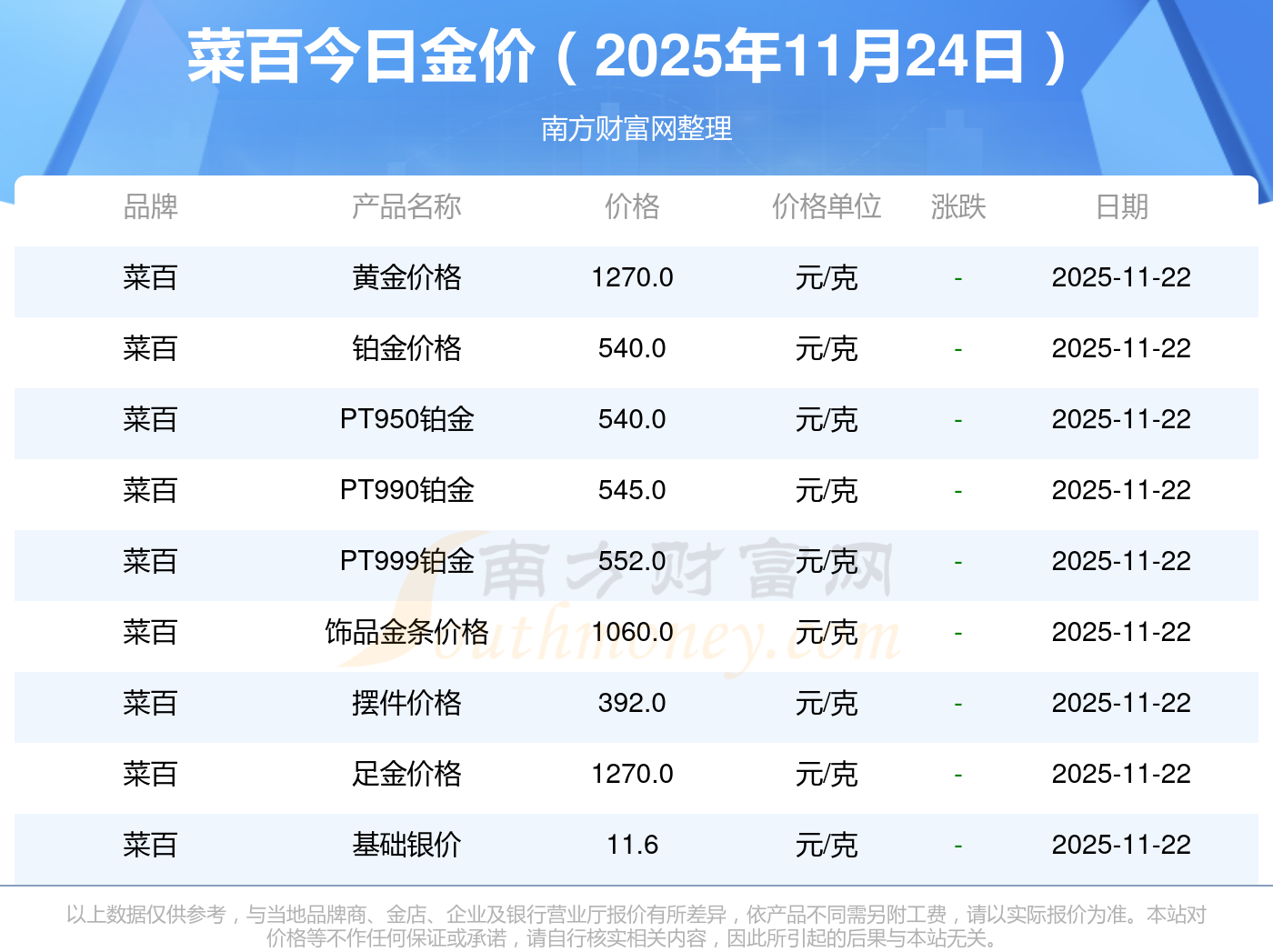 菜百黃金在今日的定價(jià)為多少?黃金價(jià)格1295.0元/克,鉑金價(jià)格614.0元/克,飾品金價(jià)(內(nèi)地)1295.0元/克,黃金飾品(香港)45100.0,鉑金價(jià)格(香港)17510.0,金條價(jià)格(香港)40680.0,金條金價(jià)(內(nèi)地)1134.0元/克,黃金價(jià)格1305.0元/克,鉑金價(jià)格600.0元/克,足金價(jià)格1305.0元/克,黃金價(jià)格1266.0元/克。