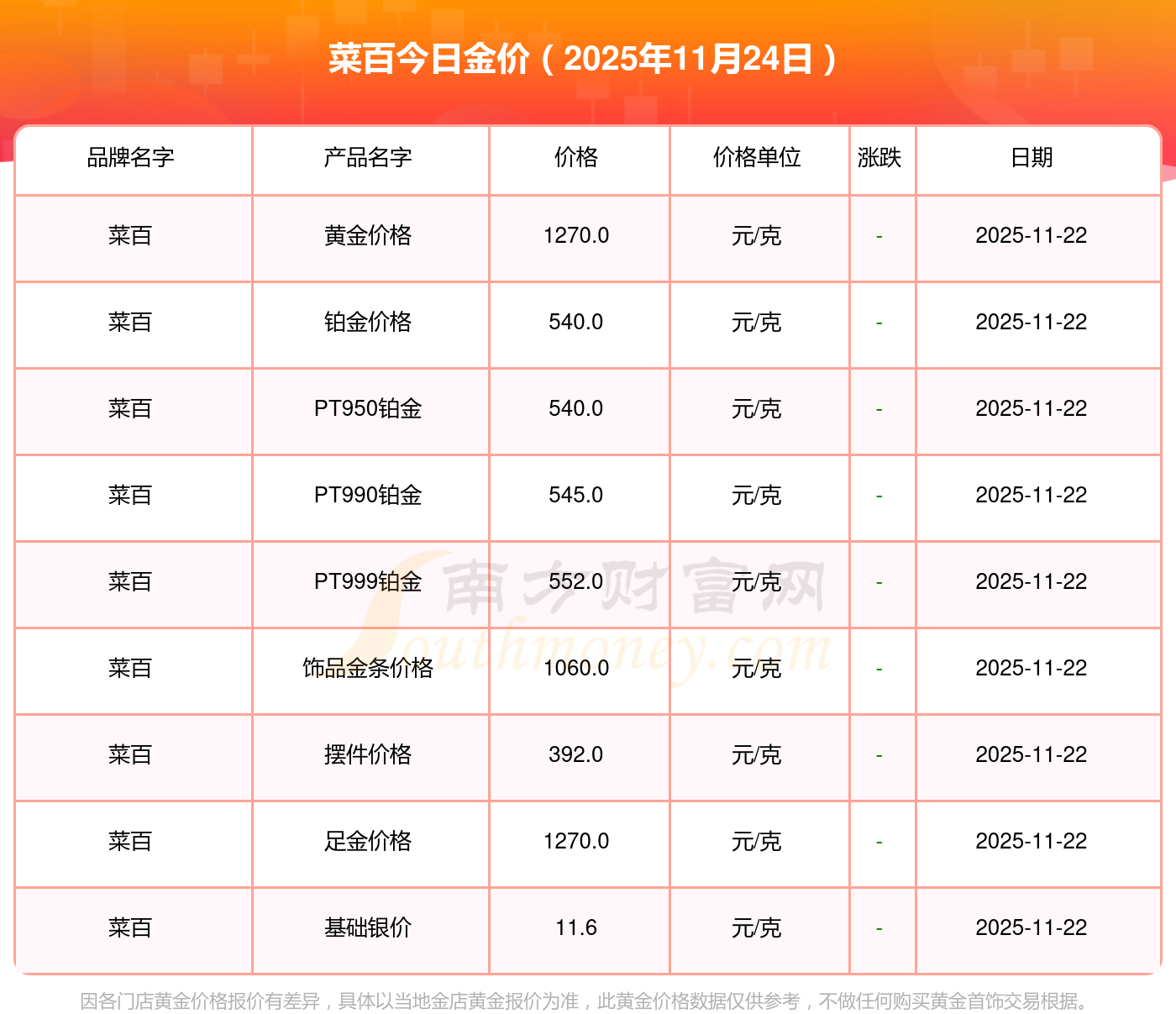 以上數(shù)據(jù)僅供參考,與當(dāng)?shù)仄放粕、金店、企業(yè)及銀行營(yíng)業(yè)廳報(bào)價(jià)有所差異,依產(chǎn)品不同需另附工費(fèi),請(qǐng)以實(shí)際報(bào)價(jià)為準(zhǔn)。本站對(duì)價(jià)格等不作任何保證或承諾,請(qǐng)自行核實(shí)相關(guān)內(nèi)容,因此所引起的后果與本站無(wú)關(guān)。