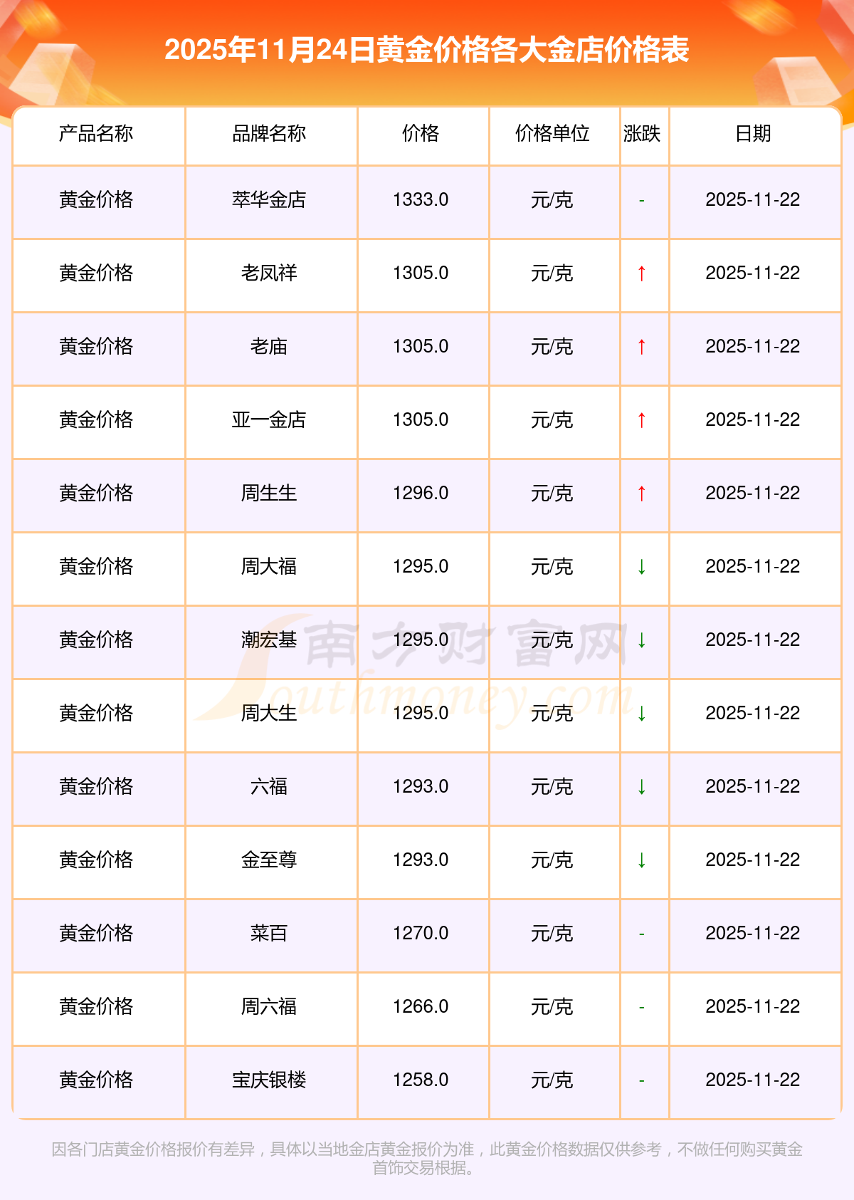 2025年11月24日各大金店黃金價(jià)格一克多少錢?各大金店黃金價(jià)格最新公布