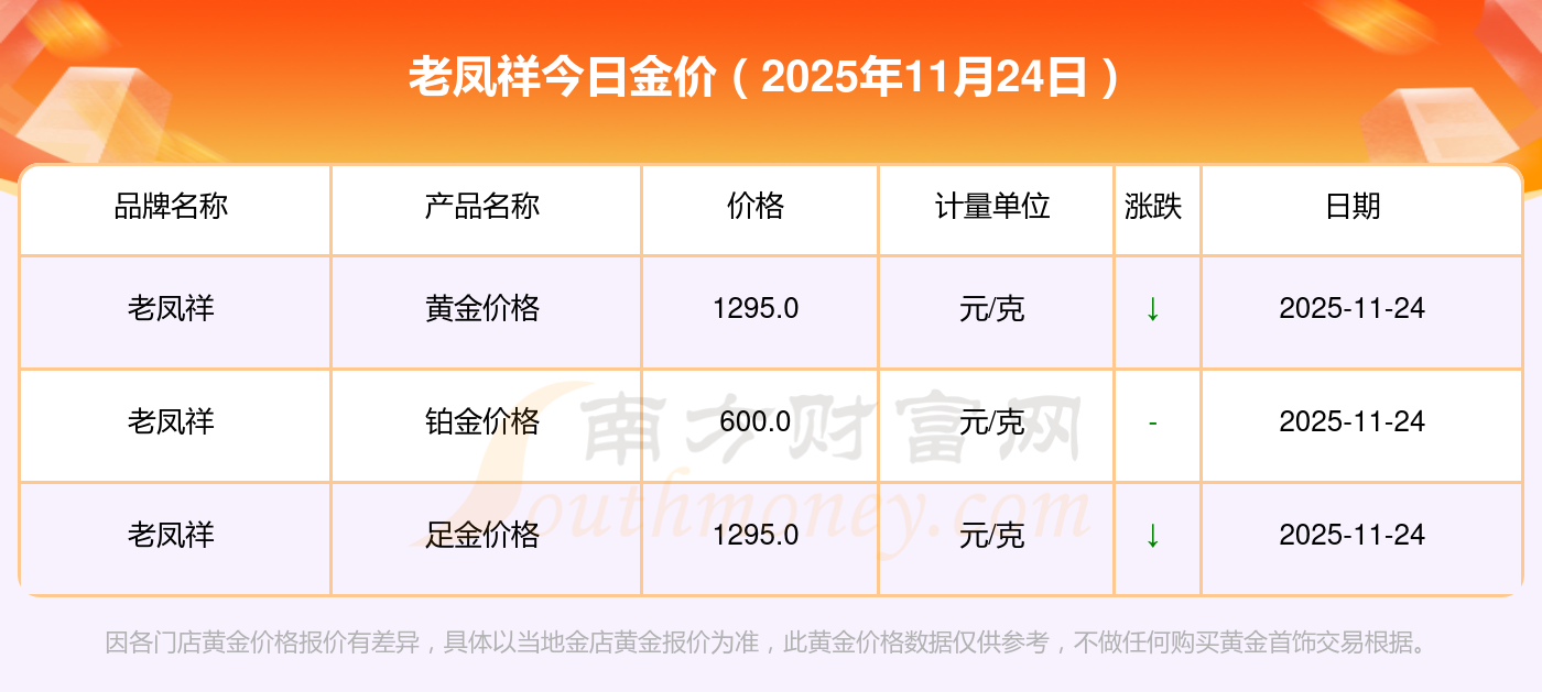 2025年11月24日周大福、周大福、周大福、老鳳祥、老鳳祥、老鳳祥、周六福、周六福、周六福、周六福、六福等各大金店品牌黃金價(jià)格最新價(jià)格如下:周大福鉑金價(jià)格(香港)17630.0,周大福金條價(jià)格(香港)40570.0,周大福金條金價(jià)(內(nèi)地)1134.0元/克,老鳳祥黃金價(jià)格1295.0元/克,老鳳祥鉑金價(jià)格600.0元/克,老鳳祥足金價(jià)格1295.0元/克,周六福黃金價(jià)格1259.0元/克,周六福鉑金價(jià)格590.0元/克,周六福PT999鉑金價(jià)格590.0元/克,周六福金條價(jià)格1154.0元/克,六福黃金價(jià)格1293.0元/克。