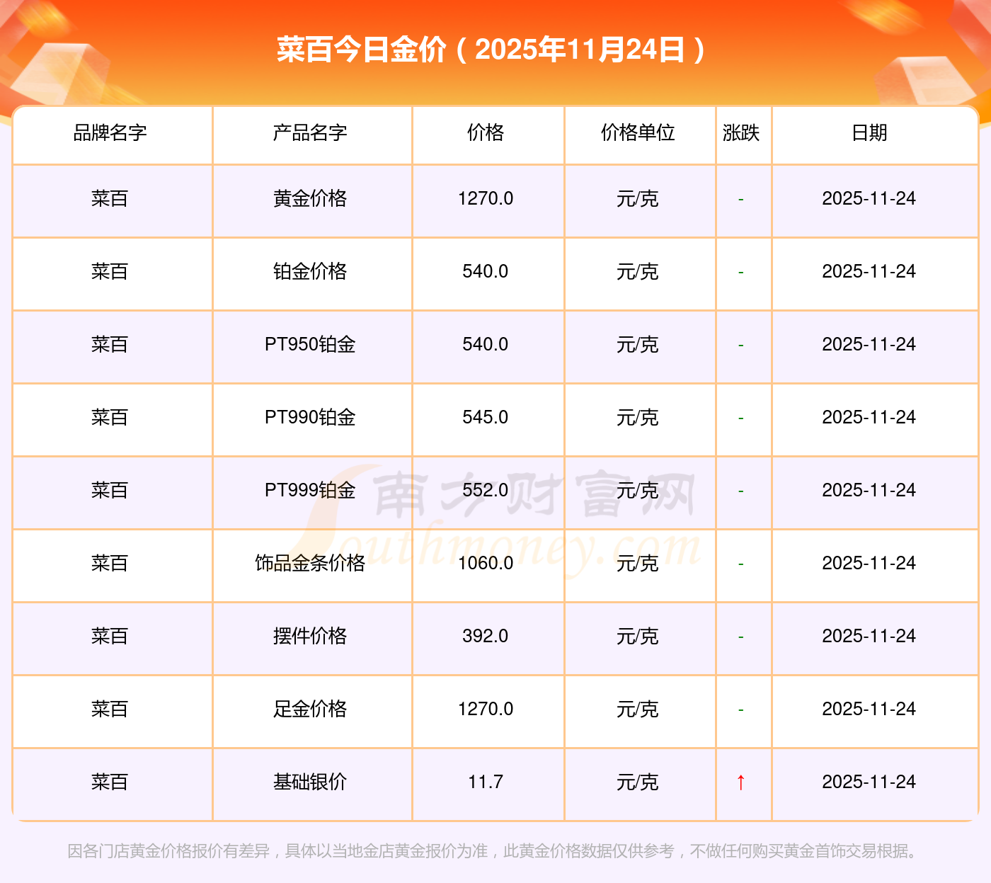 現(xiàn)在菜百黃金價格是多少錢1克_2025年菜百今日金價是多少錢一克,最新菜百查詢,2025年11月24日菜百PT999鉑金現(xiàn)在每克多少錢?最新菜百PT999鉑金報價公布,一起來看看吧!