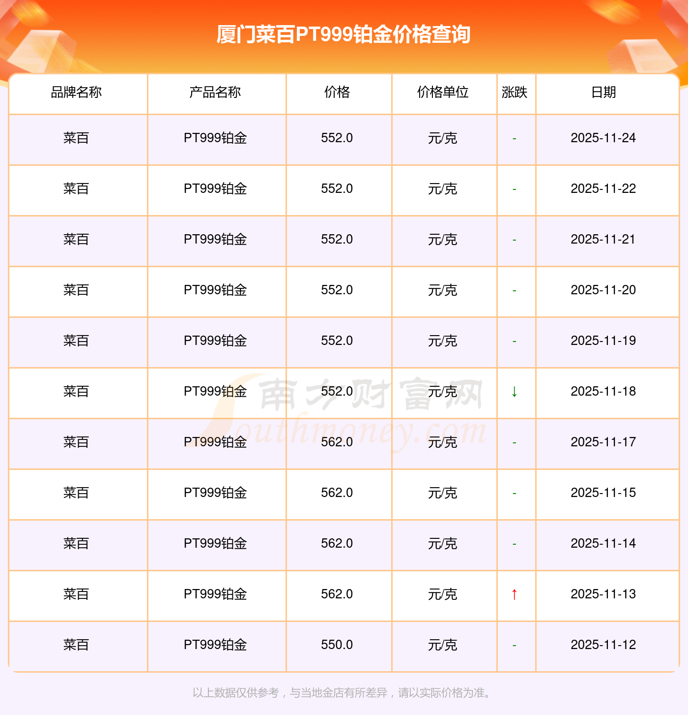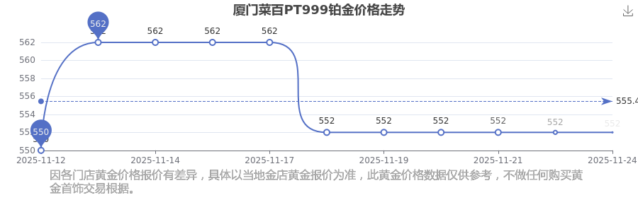(2025年11月24日)今日廈門菜百PT999鉑金價(jià)格是552.0元/克。