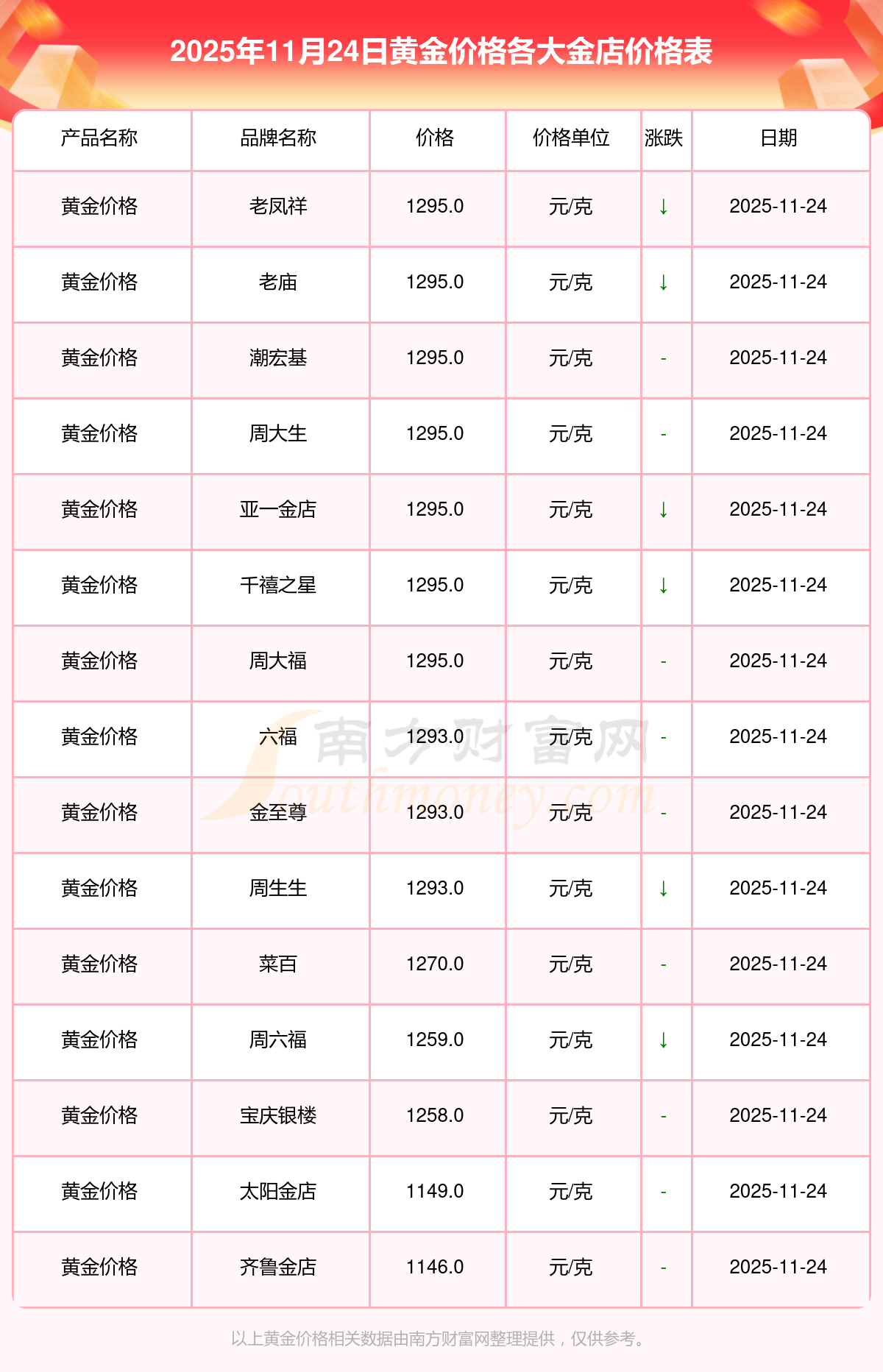 今天是2025年11月24日,周大福、周大福、周大福、老鳳祥、老鳳祥、老鳳祥、周六福、周六福、周六福、周六福、六福等各大金店品牌黃金價(jià)格最新價(jià)格如下:周大福17630.0、周大福40570.0、周大福1134.0元/克、老鳳祥1295.0元/克、老鳳祥600.0元/克、老鳳祥1295.0元/克、周六福1259.0元/克、周六福590.0元/克、周六福590.0元/克、周六福1154.0元/克、六福1293.0元/克。