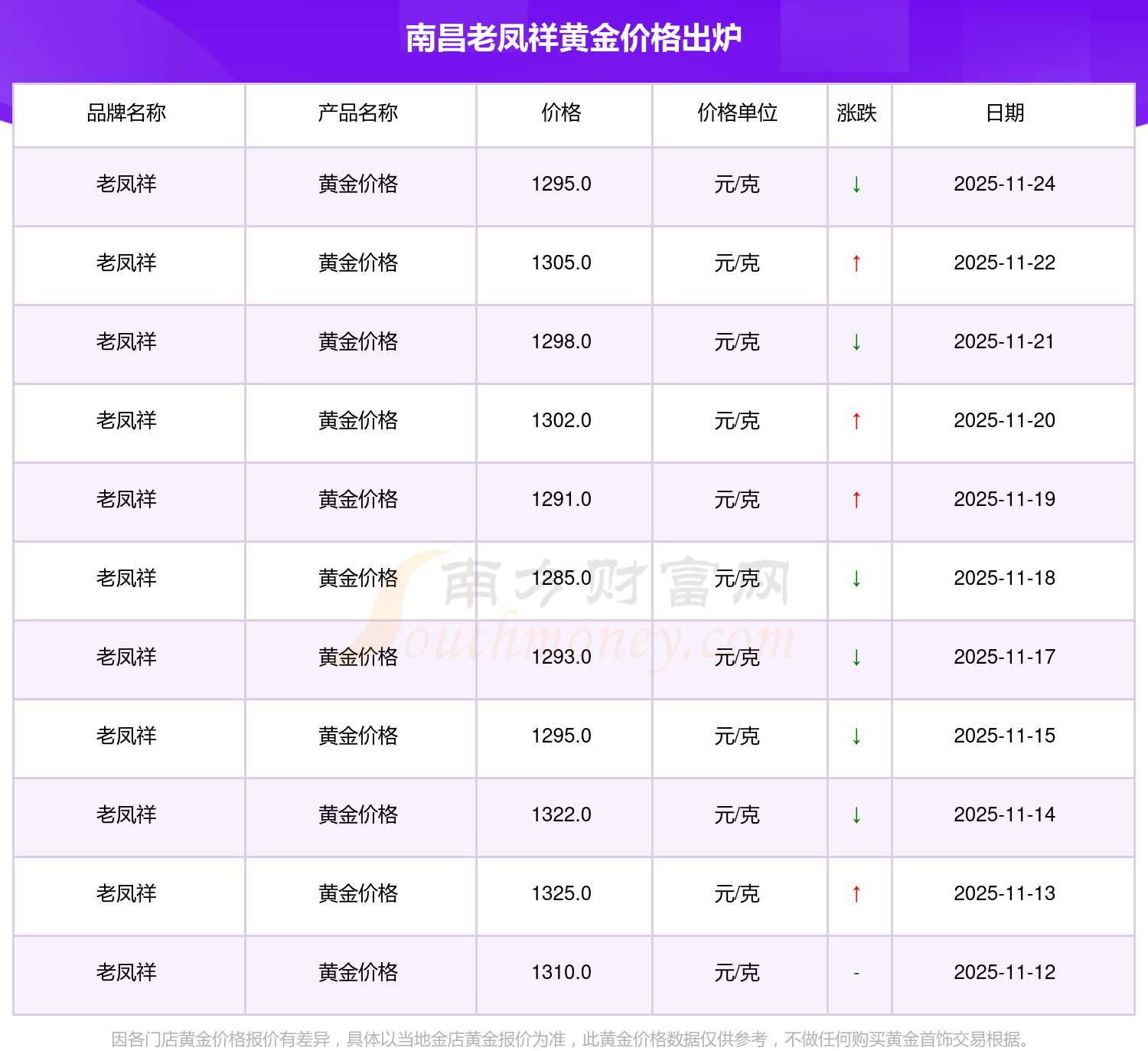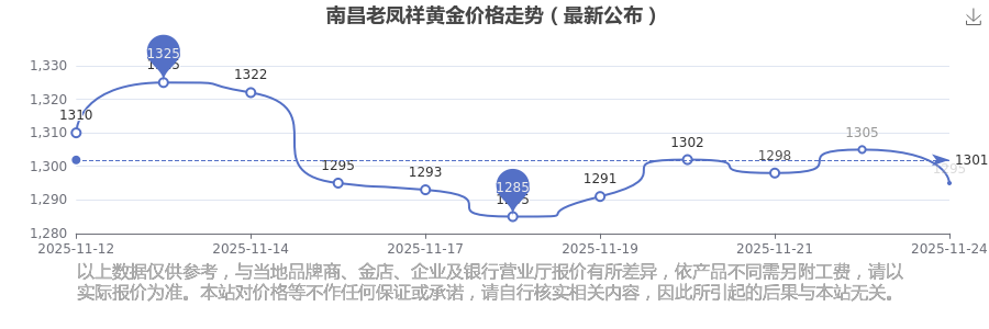 今日南昌老鳳祥黃金價(jià)格查詢,2025年11月24日,南昌老鳳祥所售黃金價(jià)格,其價(jià)格設(shè)定為 1295.0元/克。