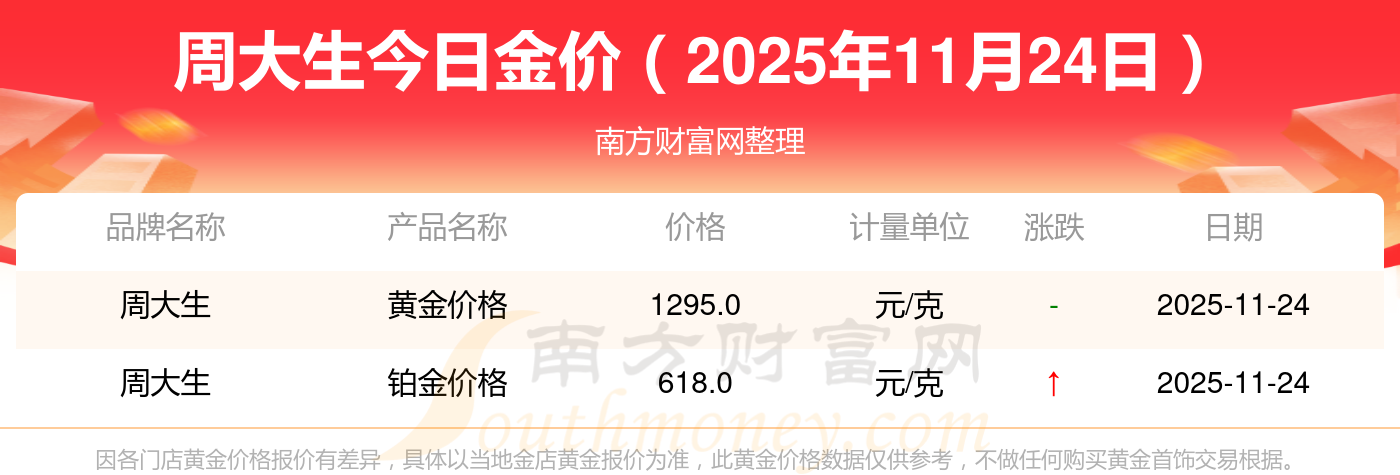 周大生金價(jià)今日價(jià)格:鉑金價(jià)格(香港)17630.0,金條價(jià)格(香港)40570.0,金條金價(jià)(內(nèi)地)1134.0元/克,黃金價(jià)格1295.0元/克,鉑金價(jià)格600.0元/克,足金價(jià)格1295.0元/克,黃金價(jià)格1259.0元/克,鉑金價(jià)格590.0元/克,PT999鉑金價(jià)格590.0元/克,金條價(jià)格1154.0元/克,黃金價(jià)格1293.0元/克。