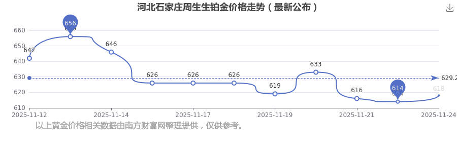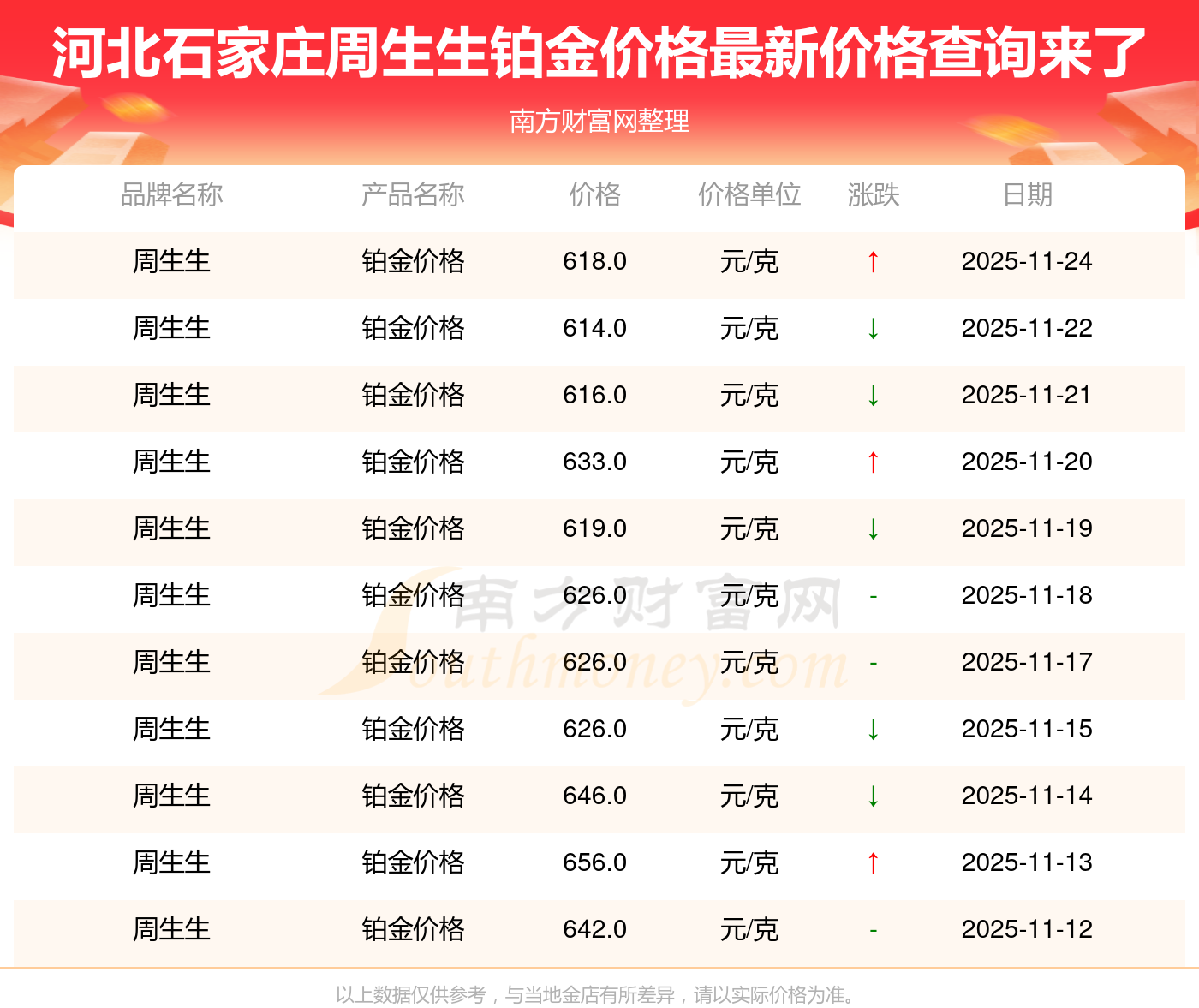 河北石家莊周生生鉑金價格在 2025年11月24日,其市場價格為 618.0元/克。