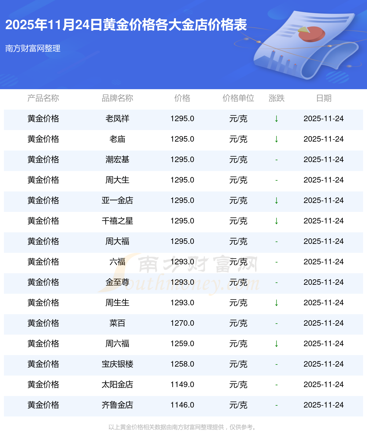 2025年11月24日,周大福、周大福、周大福、老鳳祥、老鳳祥、老鳳祥、周六福、周六福、周六福、周六福、六福等各大金店品牌黃金價格今日價格如下:周大福17630.0、周大福40570.0、周大福1134.0元/克、老鳳祥1295.0元/克、老鳳祥600.0元/克、老鳳祥1295.0元/克、周六福1259.0元/克、周六福590.0元/克、周六福590.0元/克、周六福1154.0元/克、六福1293.0元/克。