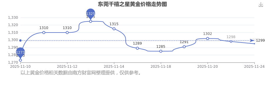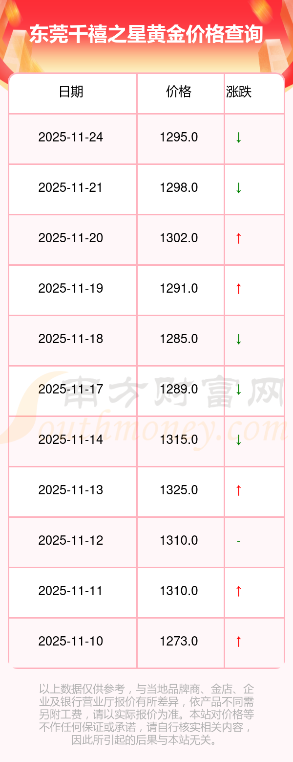 東莞千禧之星黃金價(jià)格在 2025年11月24日,其市場價(jià)格為 1295.0元/克。