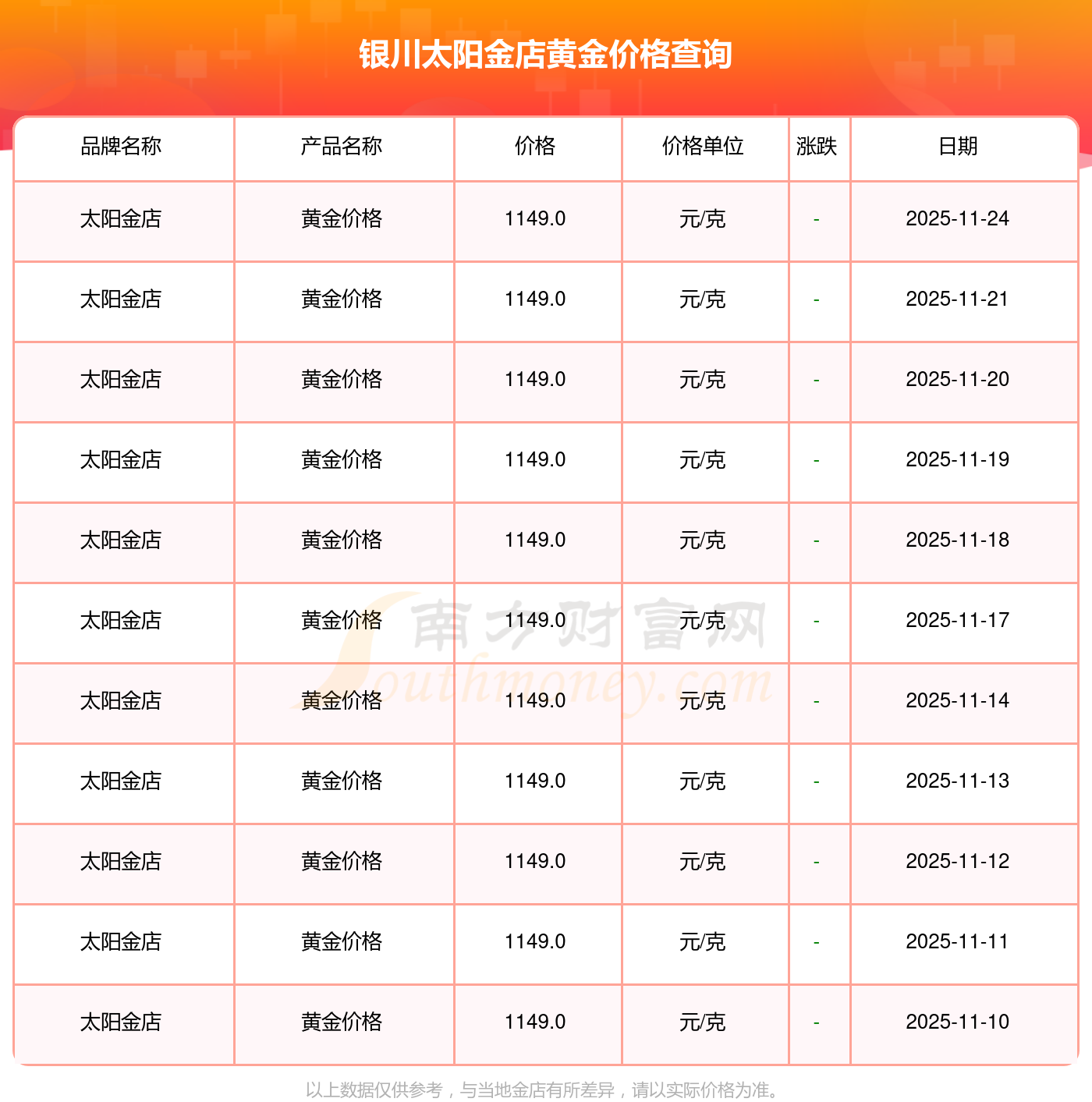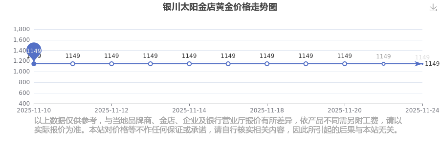 今日(2025年11月24日)銀川太陽(yáng)金店黃金價(jià)格是1149.0元/克。