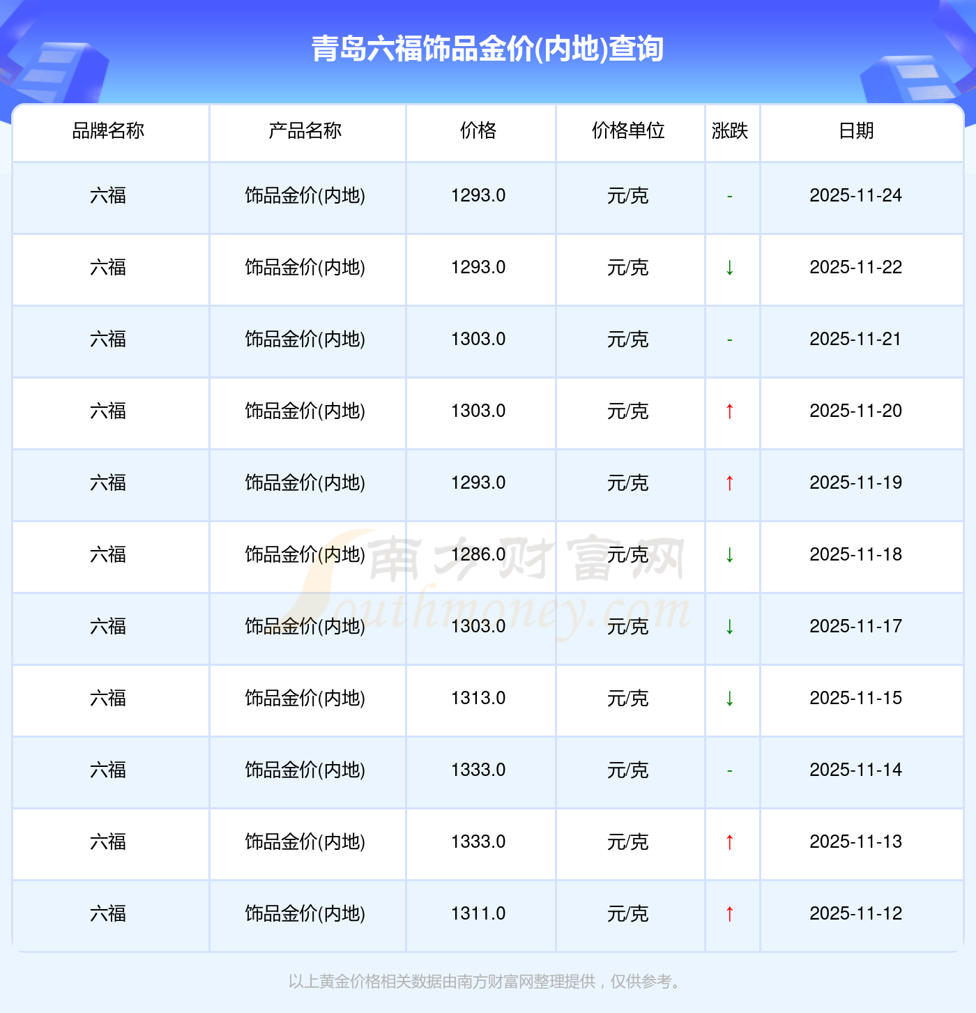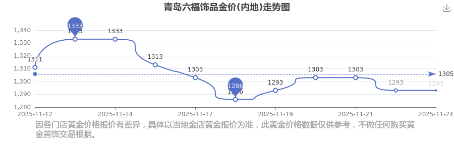 2025年11月24日,今日青島六福飾品金價(jià)(內(nèi)地):1293.0元/克。