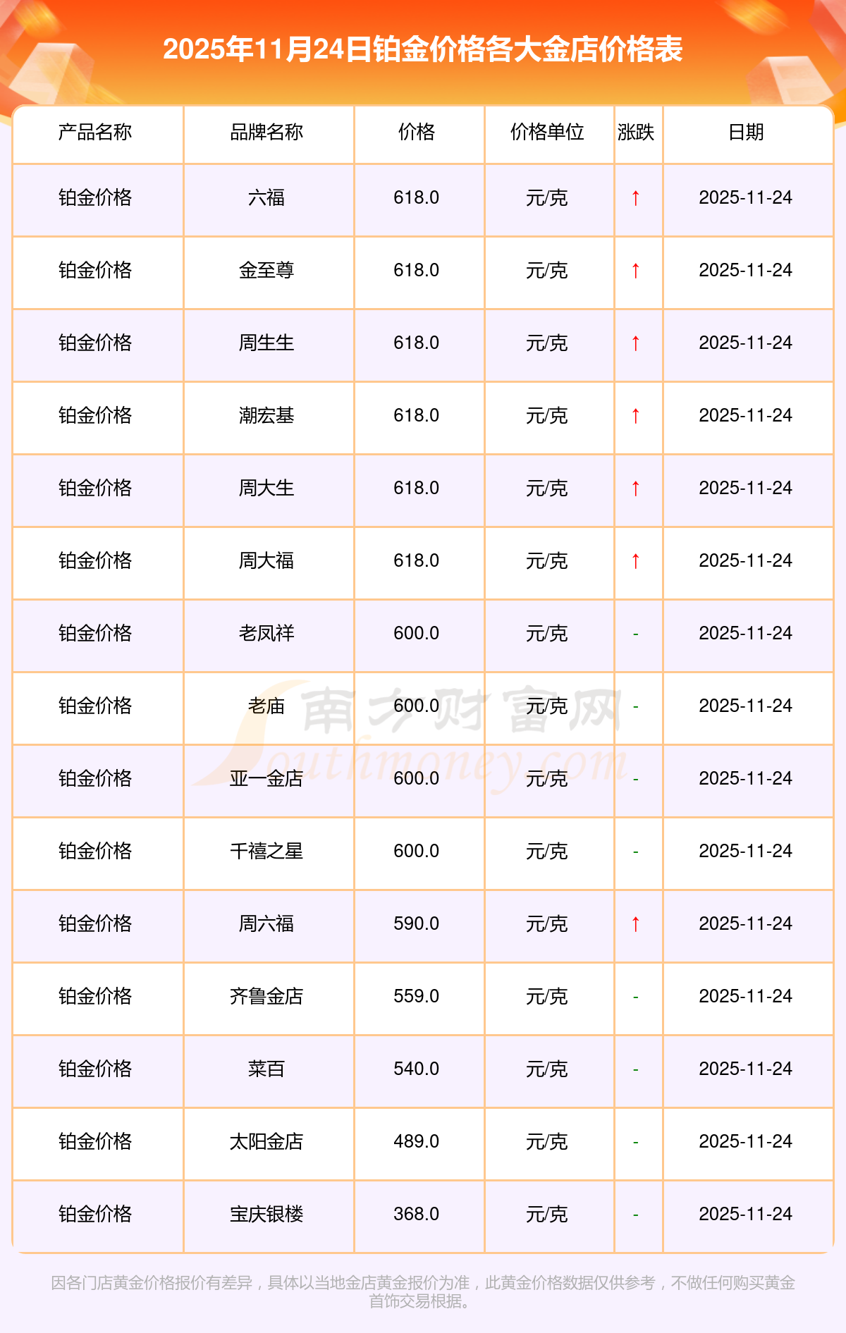 今天是2025年11月24日,周大福、周大福、周大福、老鳳祥、老鳳祥、老鳳祥、周六福、周六福、周六福、周六福、六福等各大金店品牌鉑金價格最新價格如下:周大福17630.0、周大福40570.0、周大福1134.0元/克、老鳳祥1295.0元/克、老鳳祥600.0元/克、老鳳祥1295.0元/克、周六福1259.0元/克、周六福590.0元/克、周六福590.0元/克、周六福1154.0元/克、六福1293.0元/克。