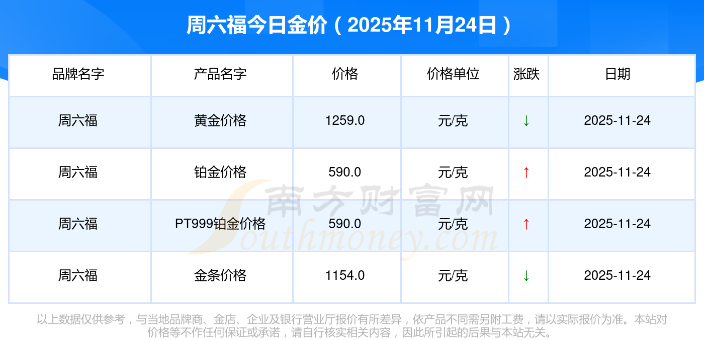 周六福今日黃金價(jià)格行情如何:鉑金價(jià)格(香港)17630.0,金條價(jià)格(香港)40570.0,金條金價(jià)(內(nèi)地)1134.0元/克,黃金價(jià)格1295.0元/克,鉑金價(jià)格600.0元/克,足金價(jià)格1295.0元/克,黃金價(jià)格1259.0元/克,鉑金價(jià)格590.0元/克,PT999鉑金價(jià)格590.0元/克,金條價(jià)格1154.0元/克,黃金價(jià)格1293.0元/克。