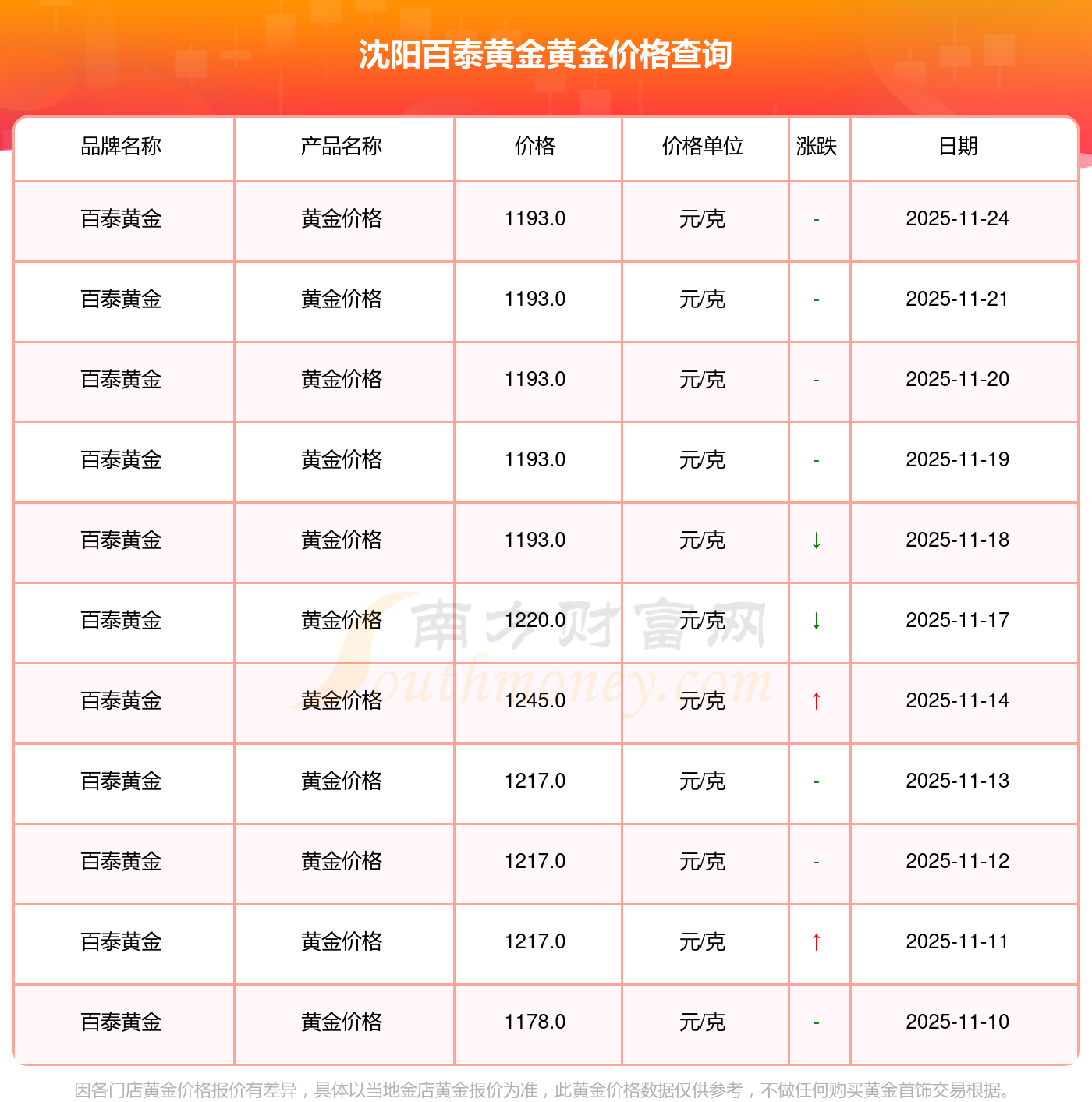 今日(2025年11月24日)沈陽(yáng)百泰黃金黃金價(jià)格:1193.0元/克。