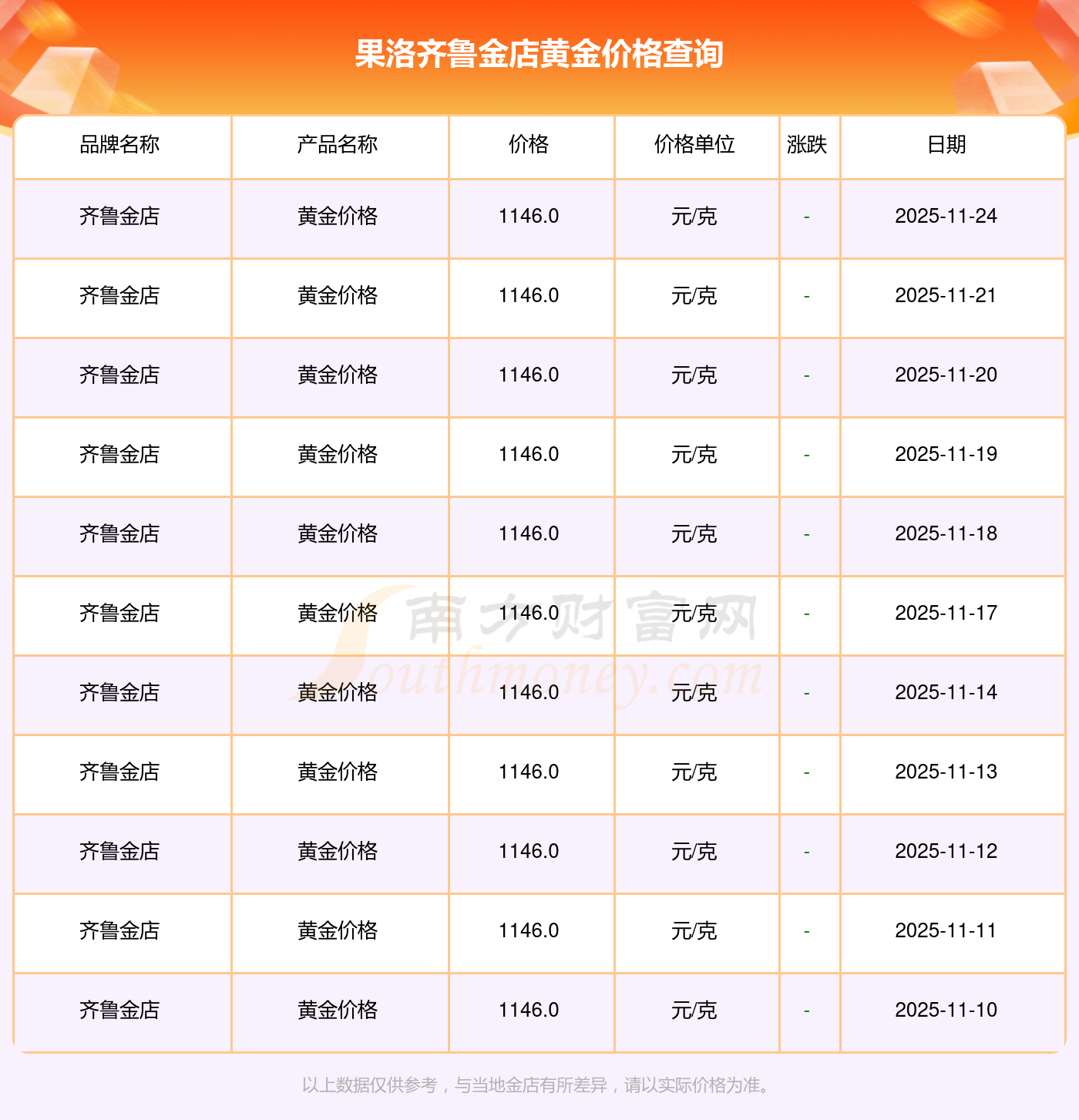 今日(2025年11月24日)果洛齊魯金店黃金價(jià)格:1146.0元/克。