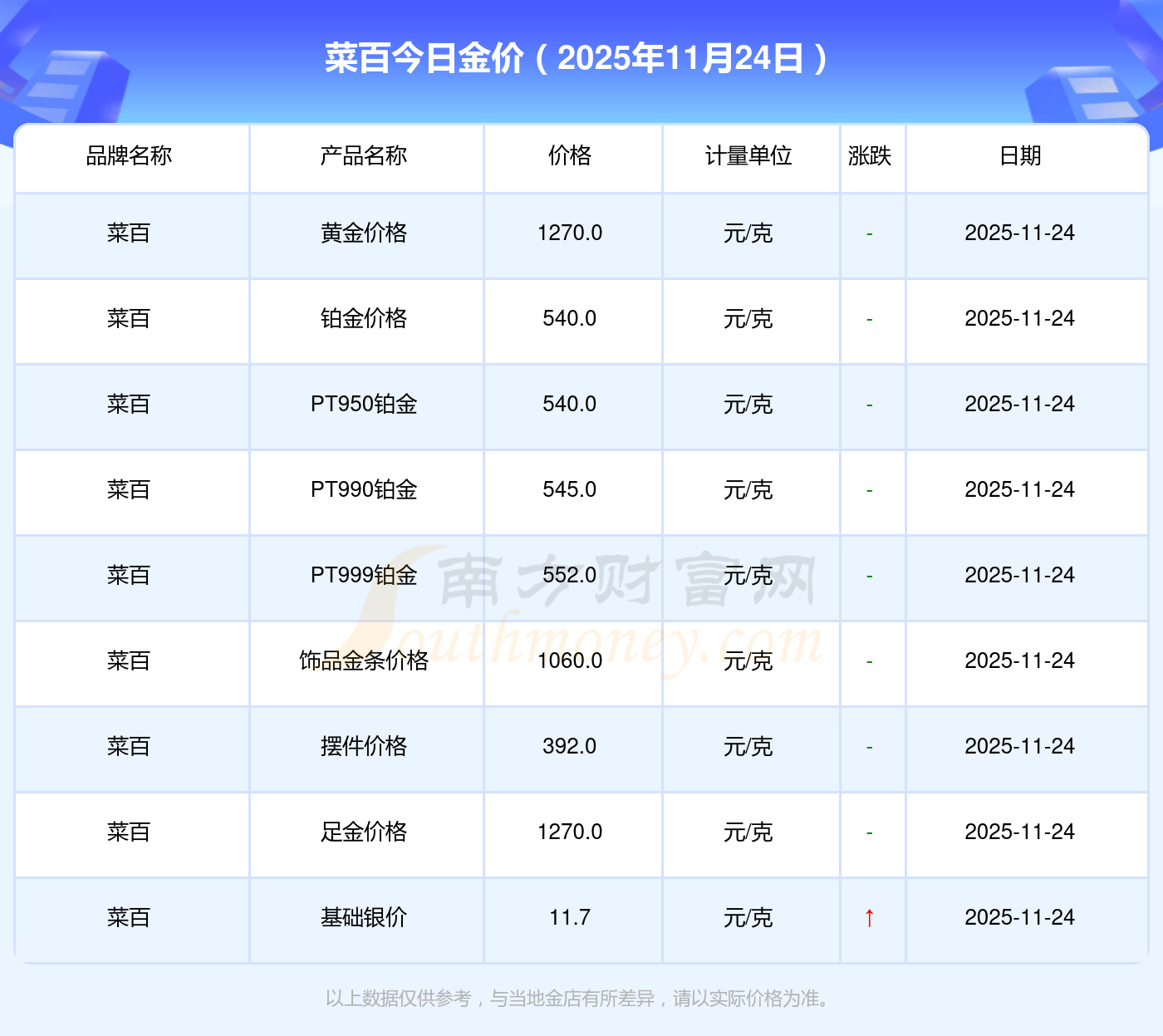 鉑金價格(香港)17630.0,金條價格(香港)40570.0,金條金價(內地)1134.0元/克,黃金價格1295.0元/克,鉑金價格600.0元/克,足金價格1295.0元/克,黃金價格1259.0元/克,鉑金價格590.0元/克,PT999鉑金價格590.0元/克,金條價格1154.0元/克,黃金價格1293.0元/克。