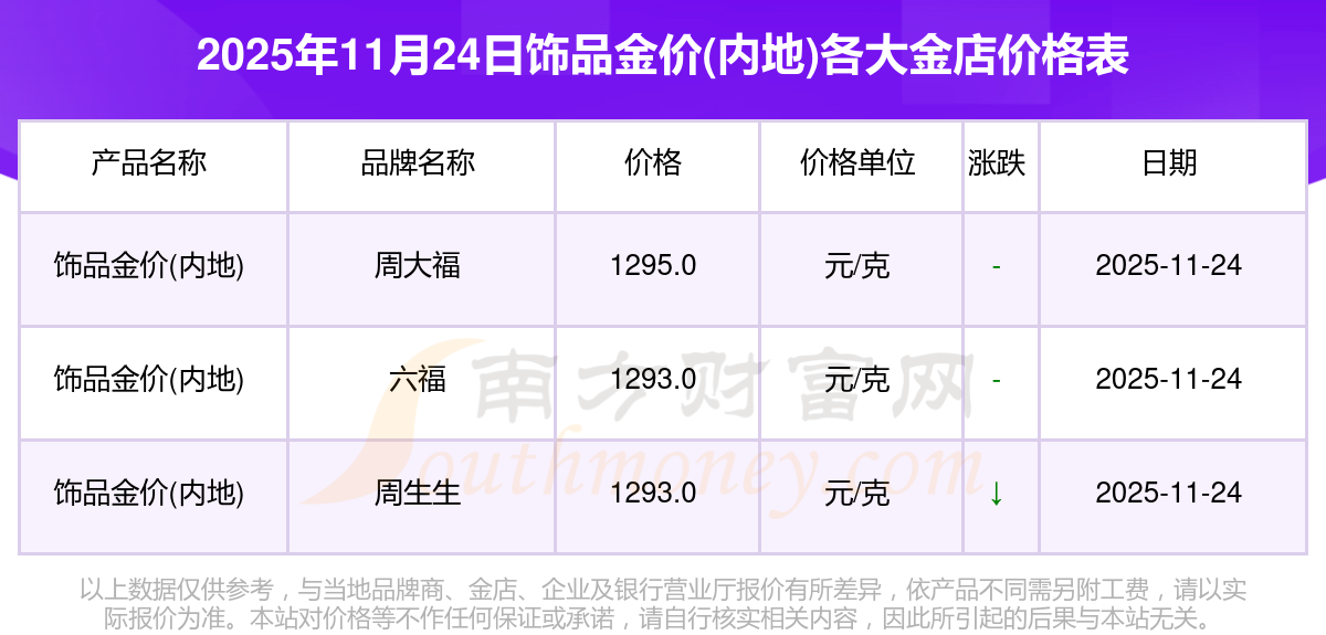 2025年11月24日各大金店飾品金價(內(nèi)地)最新價格:周大福17630.0,周大福40570.0,周大福1134.0元/克,老鳳祥1295.0元/克,老鳳祥600.0元/克,老鳳祥1295.0元/克,周六福1259.0元/克,周六福590.0元/克,周六福590.0元/克,周六福1154.0元/克,六福1293.0元/克。