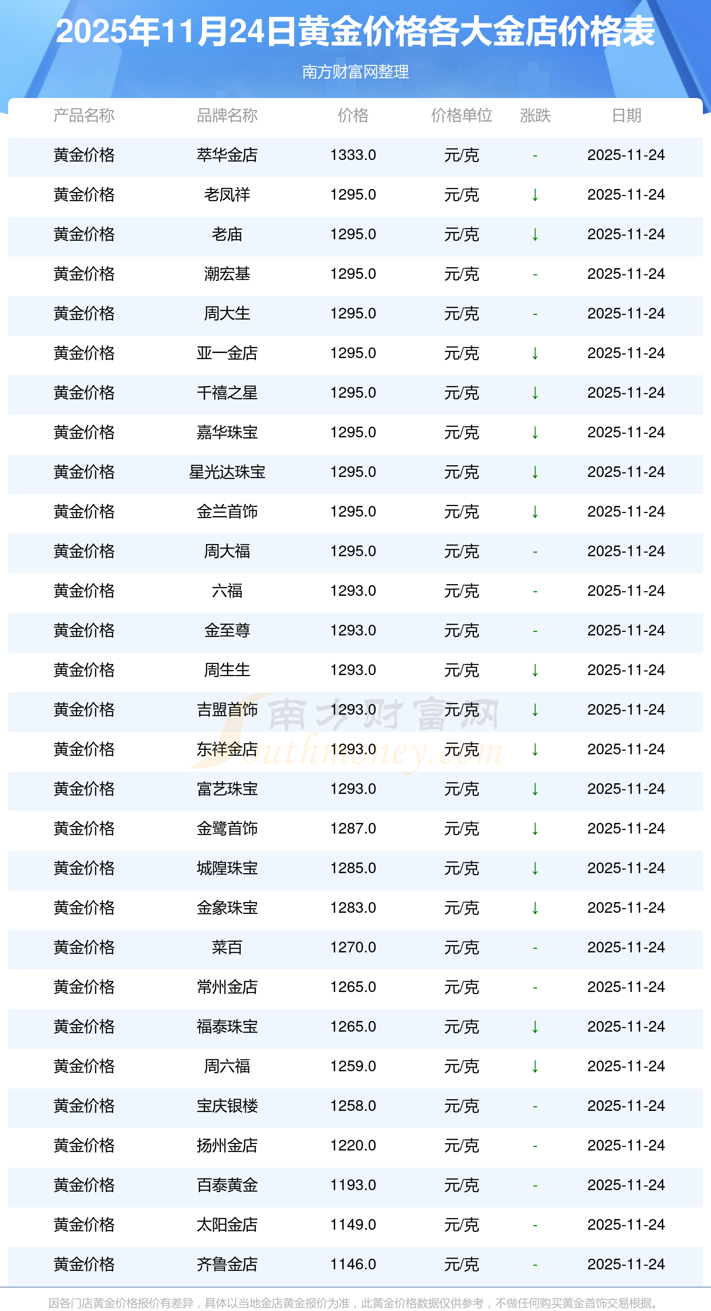 2025年11月24日周大福、周大福、周大福、老鳳祥、老鳳祥、老鳳祥、周六福、周六福、周六福、周六福、六福等各大金店品牌黃金價格最新價格如下:周大福鉑金價格(香港)17630.0,周大福金條價格(香港)40570.0,周大福金條金價(內(nèi)地)1134.0元/克,老鳳祥黃金價格1295.0元/克,老鳳祥鉑金價格600.0元/克,老鳳祥足金價格1295.0元/克,周六福黃金價格1259.0元/克,周六福鉑金價格590.0元/克,周六福PT999鉑金價格590.0元/克,周六福金條價格1154.0元/克,六福黃金價格1293.0元/克。