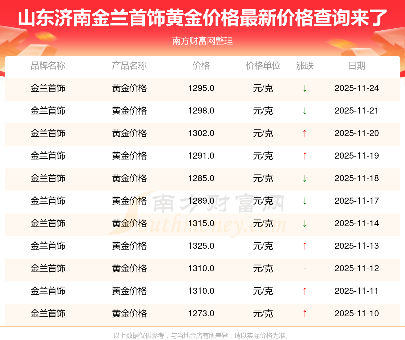 今日(2025年11月24日),1295.0元/克是山東濟(jì)南金蘭首飾黃金價(jià)格的價(jià)格標(biāo)準(zhǔn)。