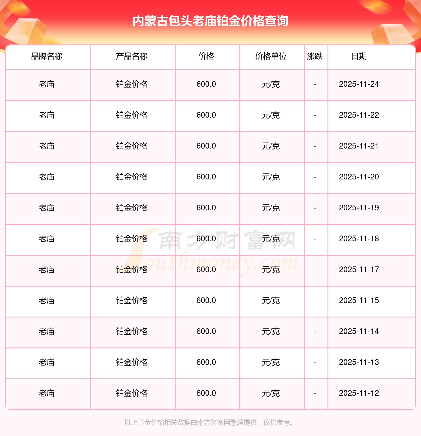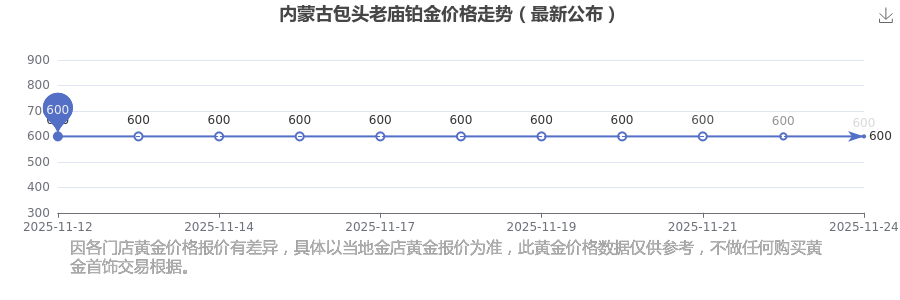 內(nèi)蒙古包頭老廟鉑金價(jià)格在 2025年11月24日為 600.0元/克。