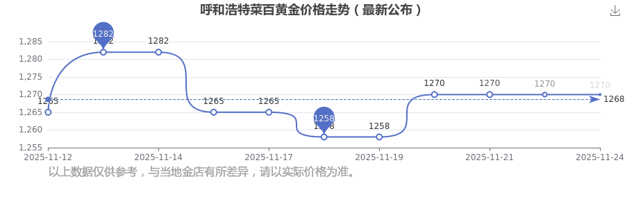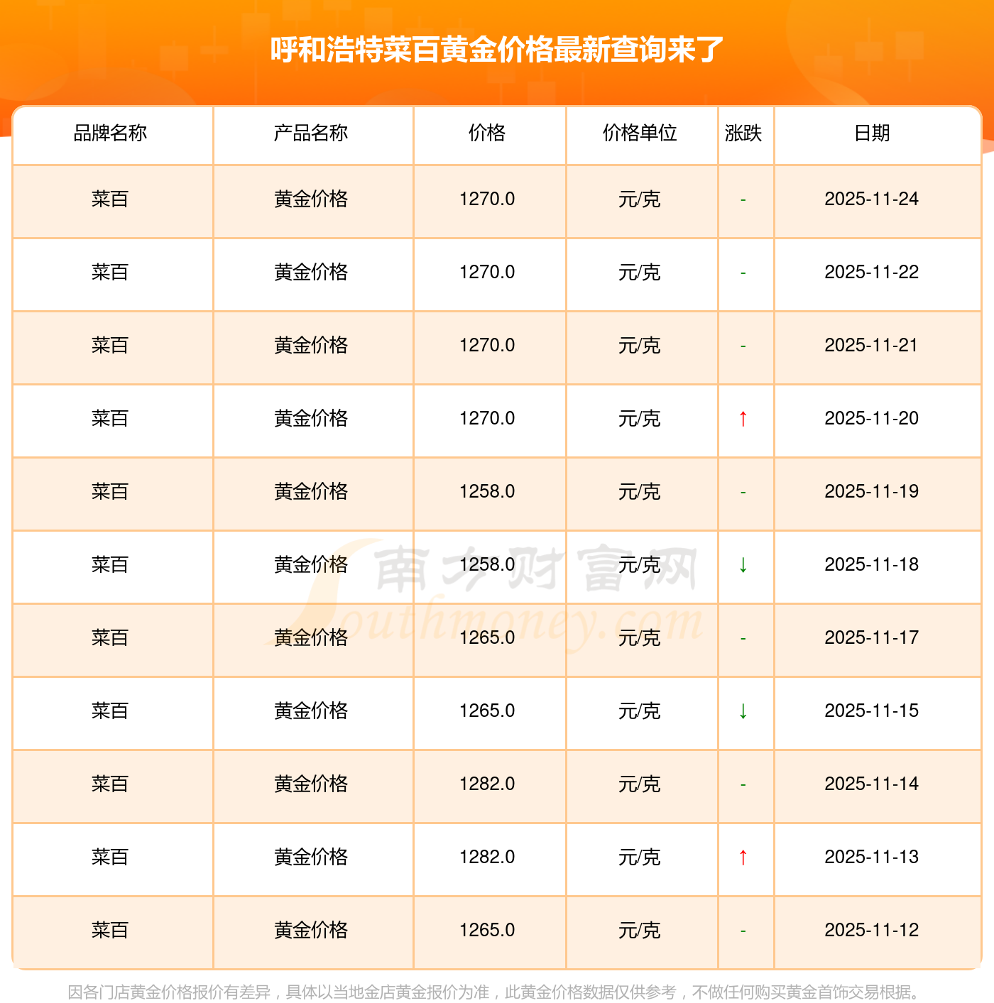 呼和浩特菜百黃金價(jià)格在 2025年11月24日為 1270.0元/克。