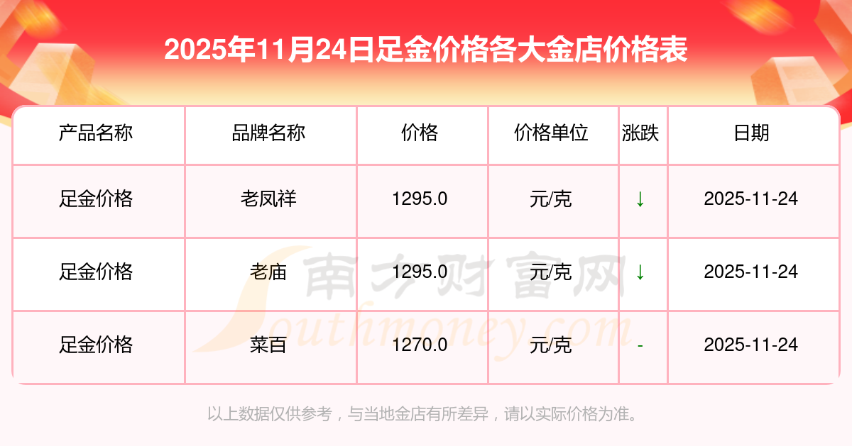 2025年11月24日周大福、周大福、周大福、老鳳祥、老鳳祥、老鳳祥、周六福、周六福、周六福、周六福、六福等各大金店品牌足金價(jià)格最新價(jià)格如下:周大福鉑金價(jià)格(香港)17630.0,周大福金條價(jià)格(香港)40570.0,周大福金條金價(jià)(內(nèi)地)1134.0元/克,老鳳祥黃金價(jià)格1295.0元/克,老鳳祥鉑金價(jià)格600.0元/克,老鳳祥足金價(jià)格1295.0元/克,周六福黃金價(jià)格1259.0元/克,周六福鉑金價(jià)格590.0元/克,周六福PT999鉑金價(jià)格590.0元/克,周六福金條價(jià)格1154.0元/克,六福黃金價(jià)格1293.0元/克。