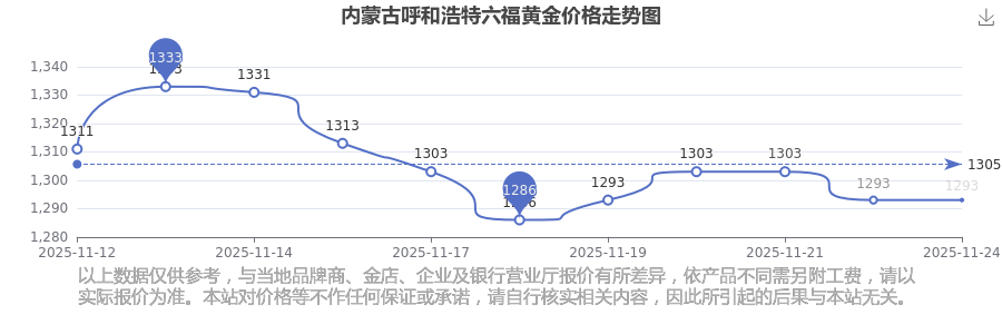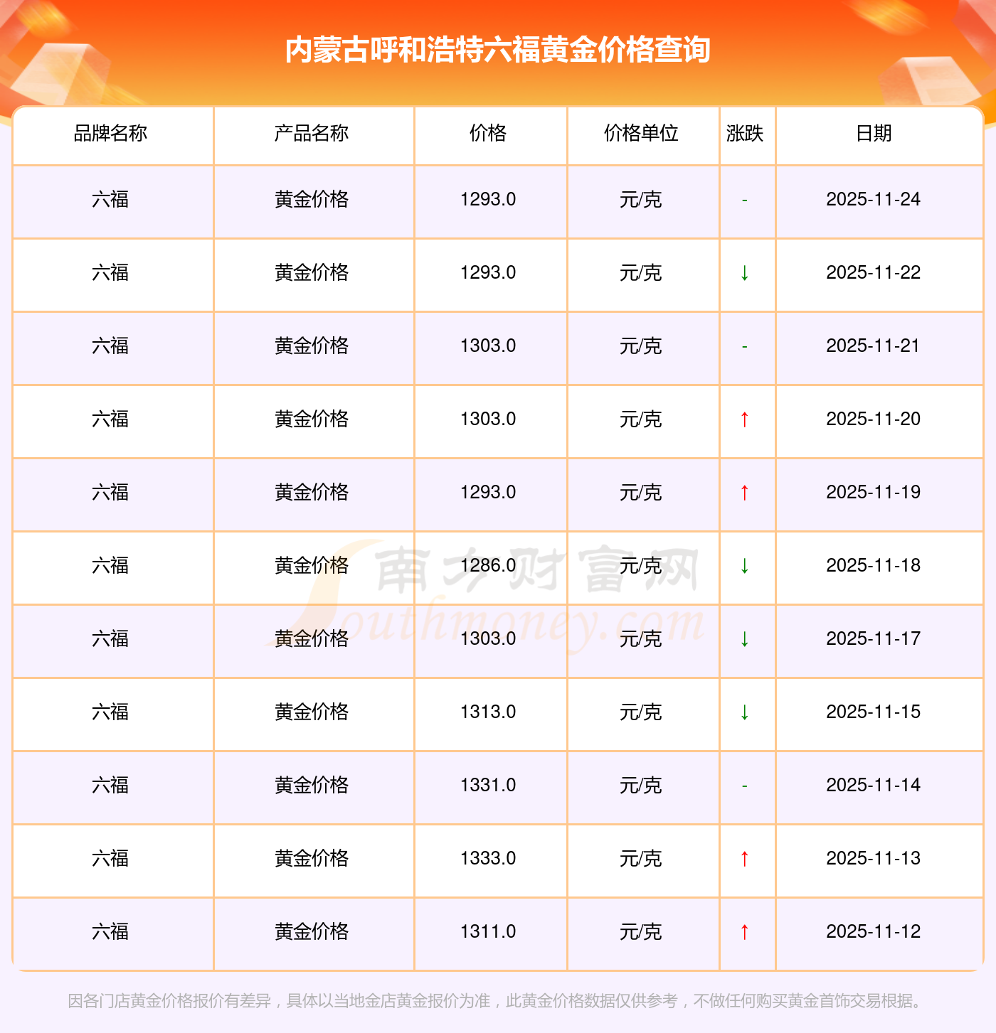 今日(2025年11月24日),內(nèi)蒙古呼和浩特六福黃金價(jià)格的定價(jià)為 1293.0元/克。