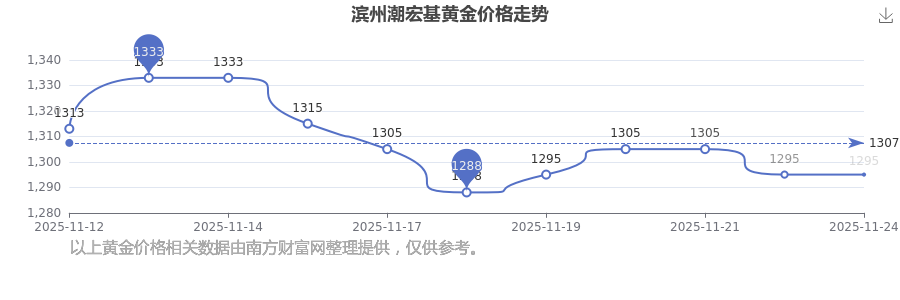 今日(2025年11月24日)濱州潮宏基黃金價格是1295.0元/克。