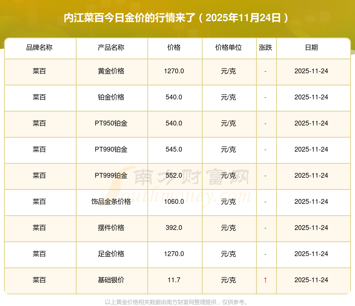 內(nèi)江菜百每克黃金在市場上賣多少錢:鉑金價格(香港)17630.0,金條價格(香港)40570.0,金條金價(內(nèi)地)1134.0元/克,黃金價格1295.0元/克,鉑金價格600.0元/克,足金價格1295.0元/克,黃金價格1259.0元/克,鉑金價格590.0元/克,PT999鉑金價格590.0元/克,金條價格1154.0元/克,黃金價格1293.0元/克。
