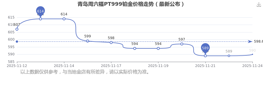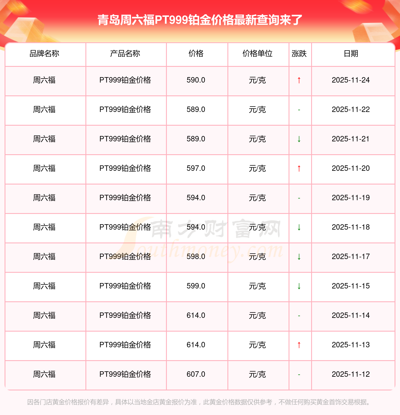 (2025年11月24日)今日青島周六福PT999鉑金價格是590.0元/克。