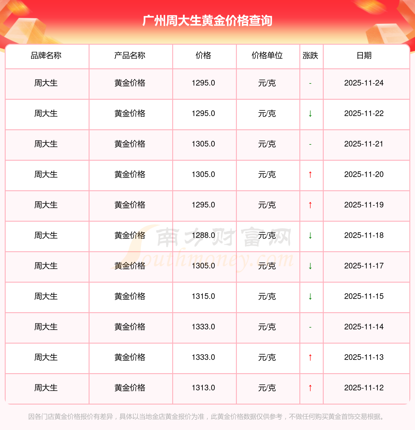 今日廣州周大生黃金價格最新為:1295.0元/克。