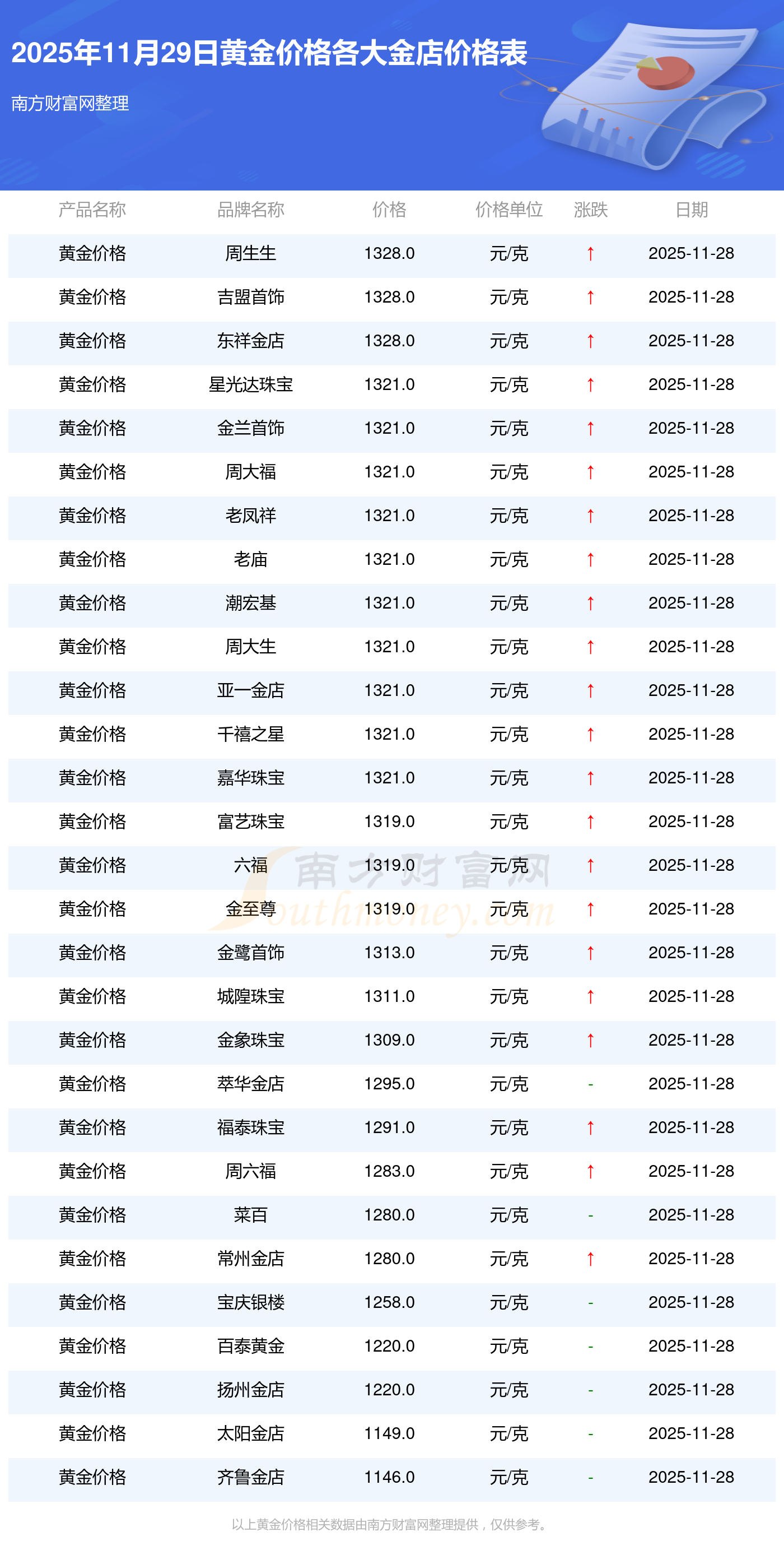 2025年11月29日,星光達(dá)珠寶、星光達(dá)珠寶、寶泉錢幣、金蘭首飾、金蘭首飾、謝瑞麟、謝瑞麟、謝瑞麟、謝瑞麟、謝瑞麟、金銀街等各大金店品牌黃金價(jià)格今日價(jià)格如下:星光達(dá)珠寶1321.0元/克、星光達(dá)珠寶600.0元/克、寶泉錢幣12.6元/克、金蘭首飾1321.0元/克、金蘭首飾600.0元/克、謝瑞麟1207.0元/克、謝瑞麟1321.0元/克、謝瑞麟46370.0、謝瑞麟13970.0、謝瑞麟41860.0、金銀街1296.0元/克。