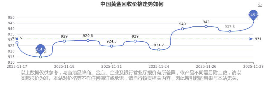 今日(2025年11月29日),中國黃金回收價格:945.5元/克。