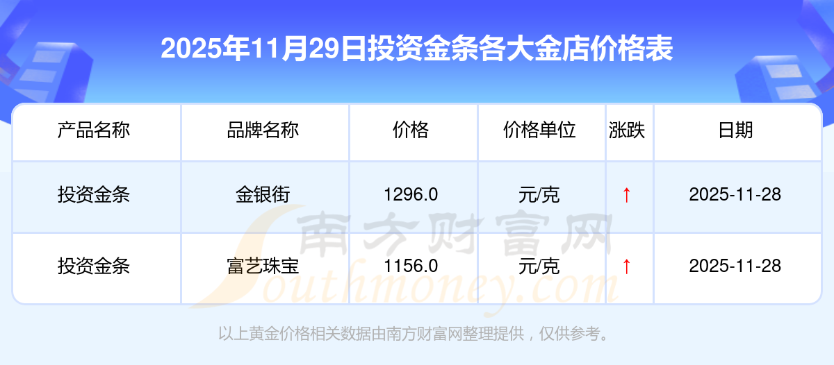 2025年11月29日各大金店投資金條價(jià)格多少一克?各大金店投資金條價(jià)格報(bào)價(jià)表詳情,每家金店的黃金價(jià)格之所以不一樣,黃金基礎(chǔ)價(jià)格是由國際黃金市場的供求關(guān)系和價(jià)格波動(dòng)所定的。金店會(huì)根據(jù)國際金價(jià)的變化來制定和調(diào)整金飾的價(jià)格。接下來隨小編來看看今日市場行情。