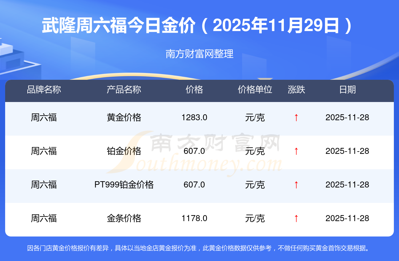 2025年11月29日武隆周六福一克黃金的售價(jià)是多少:黃金價(jià)格1321.0元/克,鉑金價(jià)格600.0元/克,銀條價(jià)格12.6元/克,黃金價(jià)格1321.0元/克,鉑金價(jià)格600.0元/克,金條價(jià)格(內(nèi)地)1207.0元/克,金飾價(jià)格(內(nèi)地)1321.0元/克,黃金飾品(香港)46370.0,鉑金飾品(香港)13970.0,金條金價(jià)(香港)41860.0,投資金條1296.0元/克。